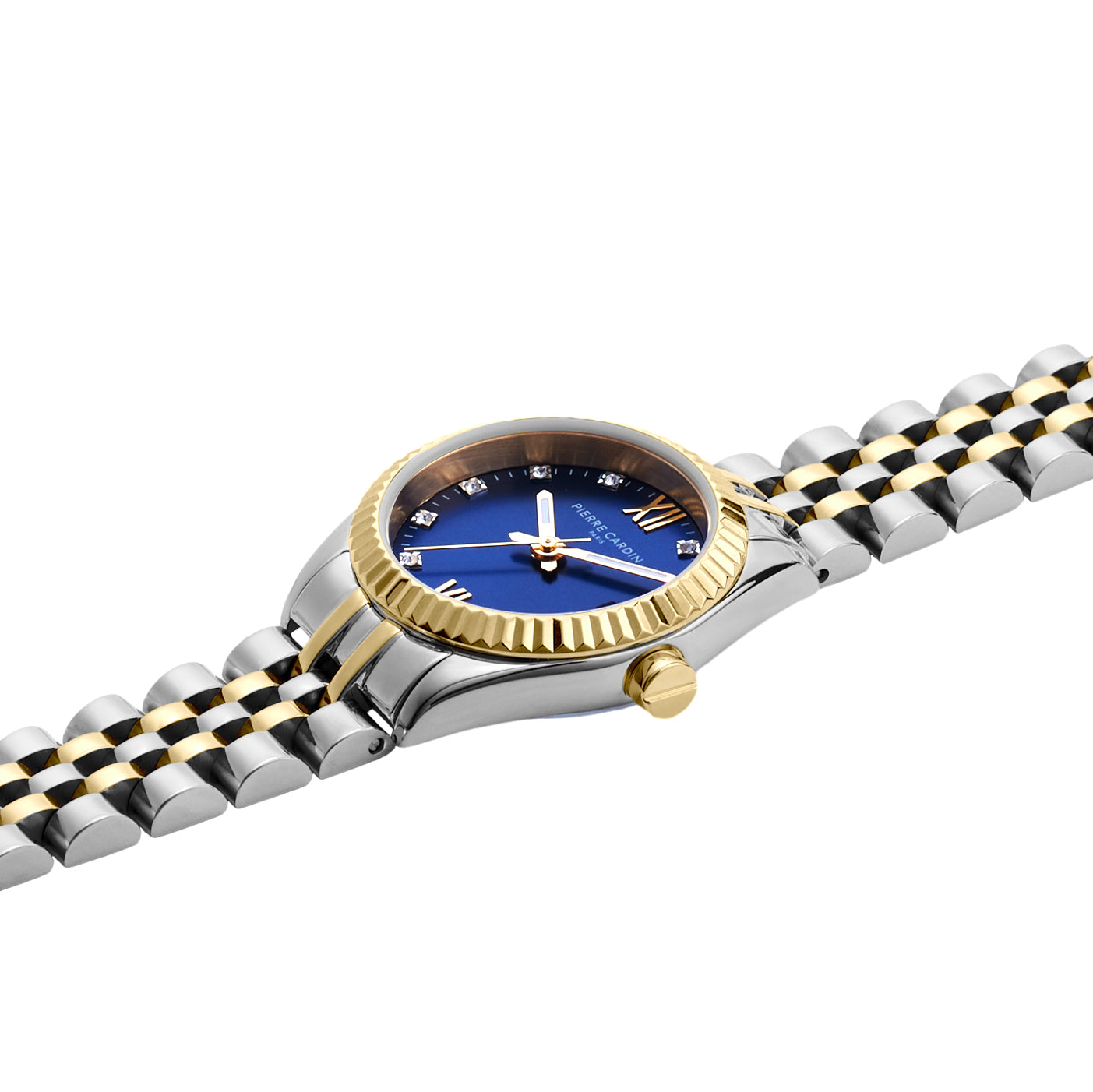 Just like the elegant Opera region of Paris which is known for its theaters, this Pierre Cardin watch is elegant and mesmerising. The fluted bezel adds a touch of luxury, this beautiful watch is made in two tone Gold and stainless steel with blue dial and Crystals on indexes. The watch also features a date function. The flawless stainless steel watch case lends a delicate and matching two tone gold and stainless steel metal link watch strap adds an additional hint of classic luxury.