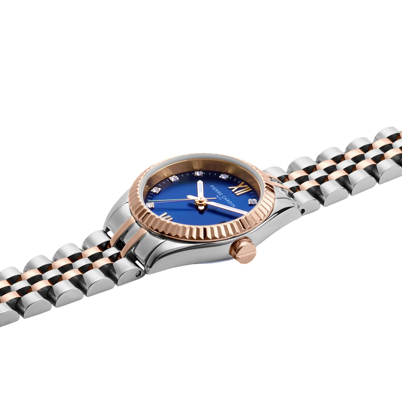Just like the elegant Opera region of Paris which is known for its theaters, this Pierre Cardin watch is elegant and mesmerising. The fluted bezel adds a touch of luxury, this beautiful watch is made in two tone rose gold and stainless steel with blue dial and Crystals on indexes. The watch also features a date function. The flawless stainless steel watch case lends a delicate and matching two tone rose gold and stainless steel metal link watch strap adds an additional hint of classic luxury.