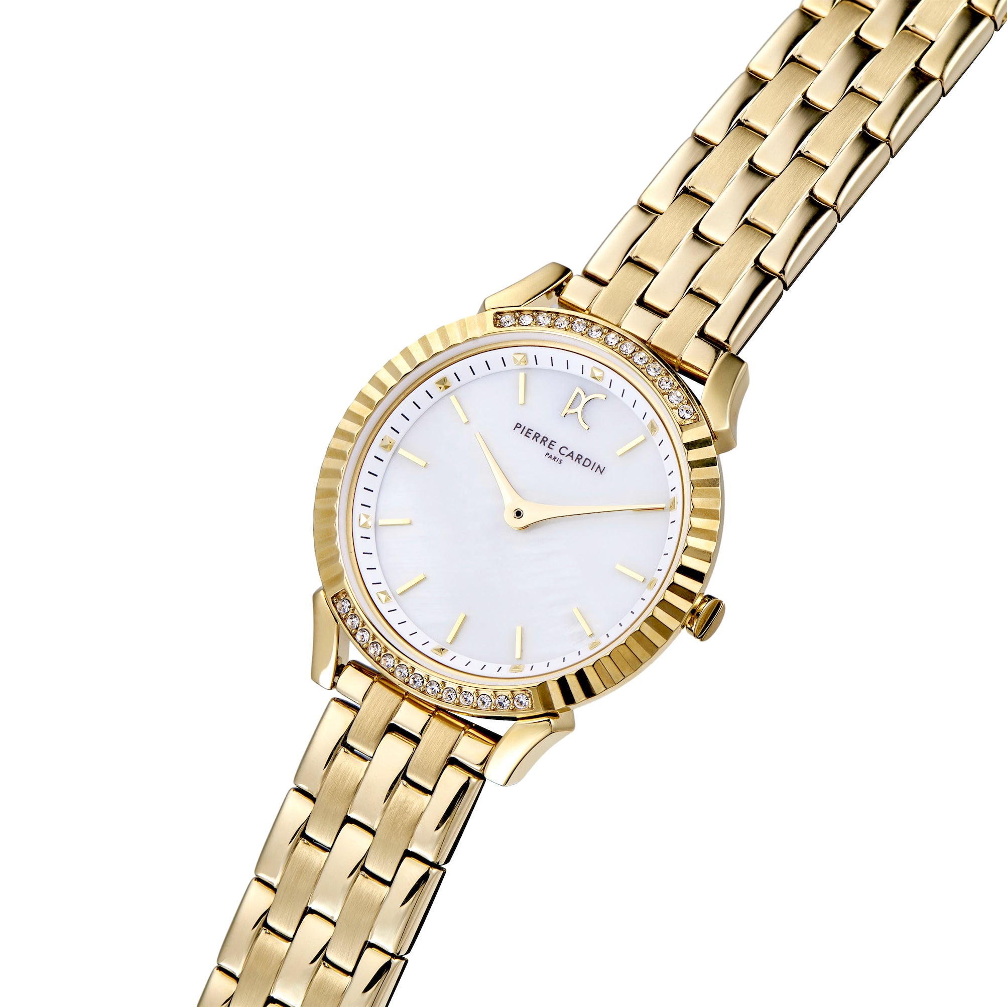 The Pigalle Gold metal strap watch is the perfect heritage tribute to the iconic style of French designer, Pierre Cardin, as well as the fashionable inspiration of the famous Pigalle district. Designed with a gold metal strap, a striking polished gold tone case and a mother of pear dial with crystals and gold tone watch hands, this on-trend women’s timepiece is destined to become a fashion statement accessory.
