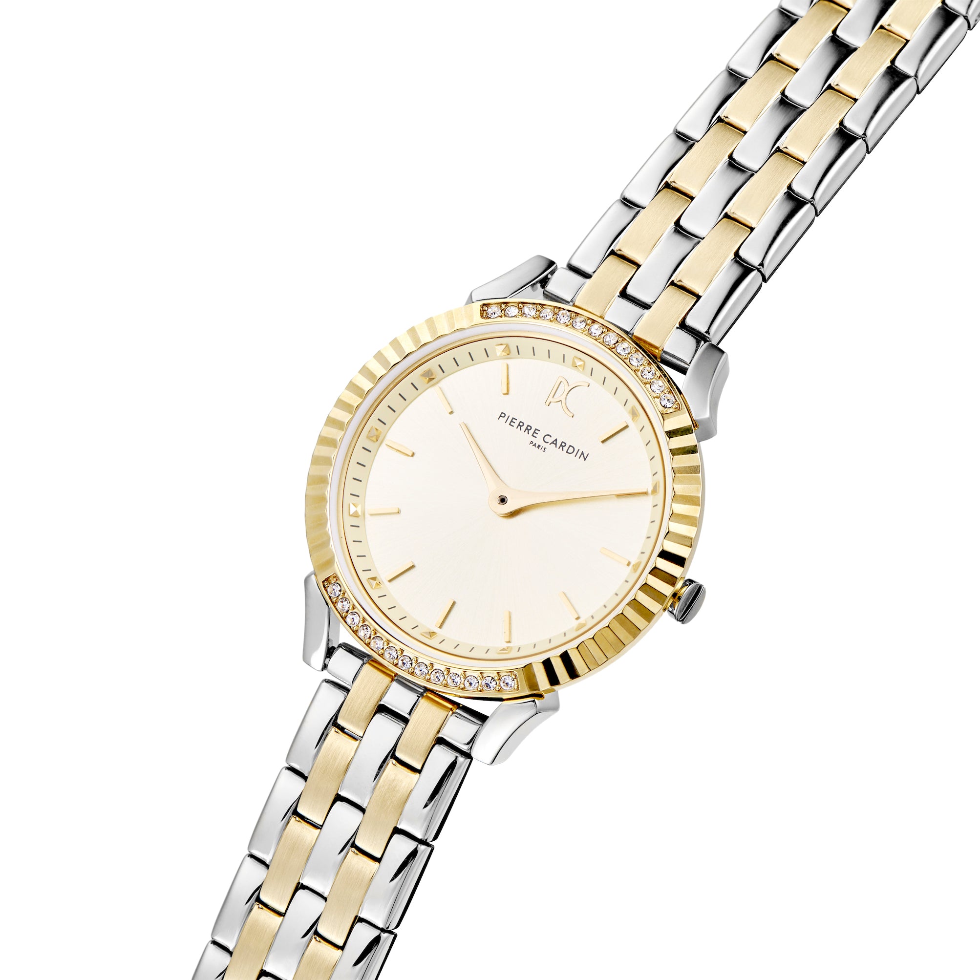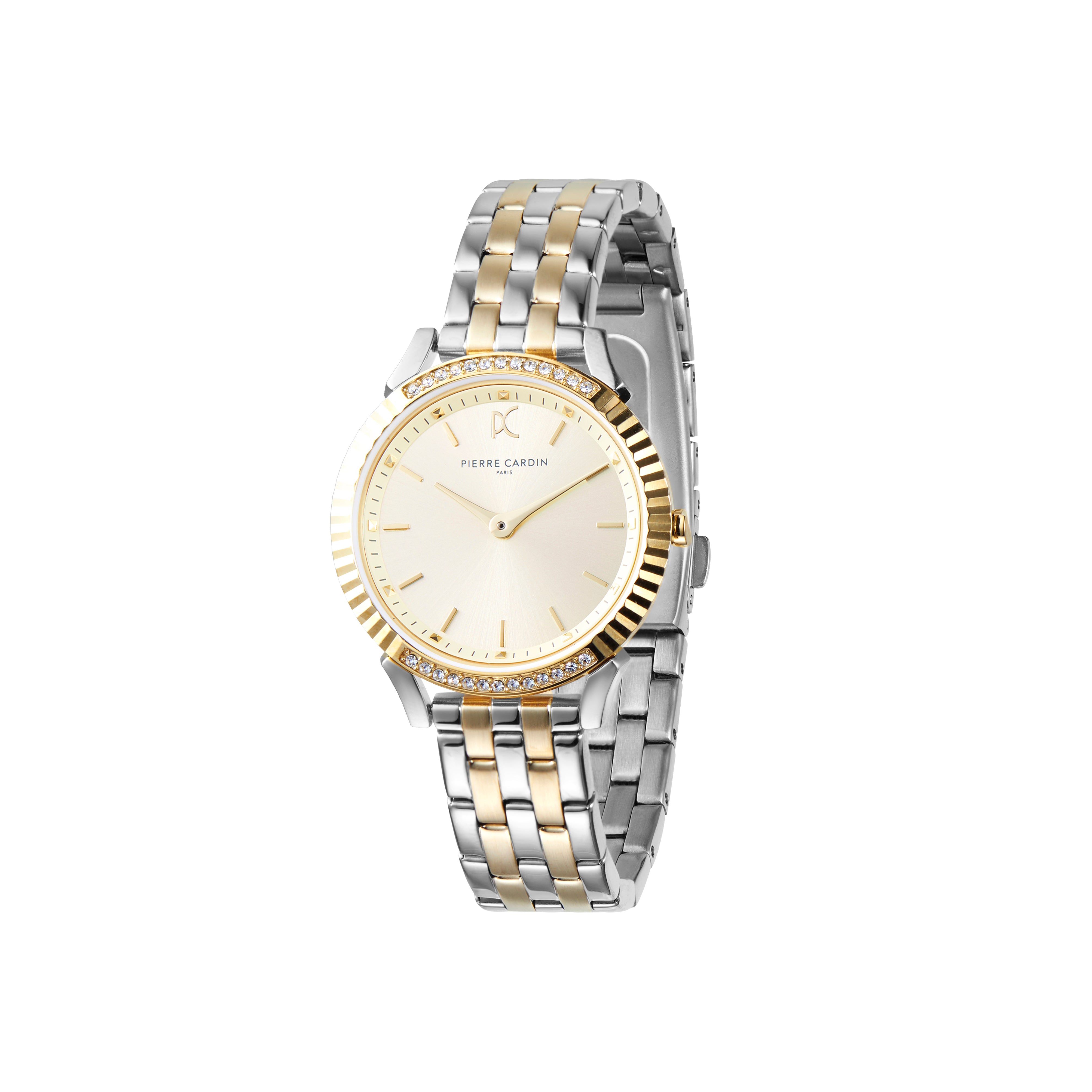 The Pigalle two tone Gold and Stainless steel watch with metal strap is the perfect heritage tribute to the iconic style of French designer, Pierre Cardin, as well as the fashionable inspiration of the famous Pigalle district. Designed with a two tone gold steel metal strap, a striking polished gold case and a champagne dial with crystals and gold watch hands, this on-trend women’s timepiece is destined to become a fashion statement accessory.