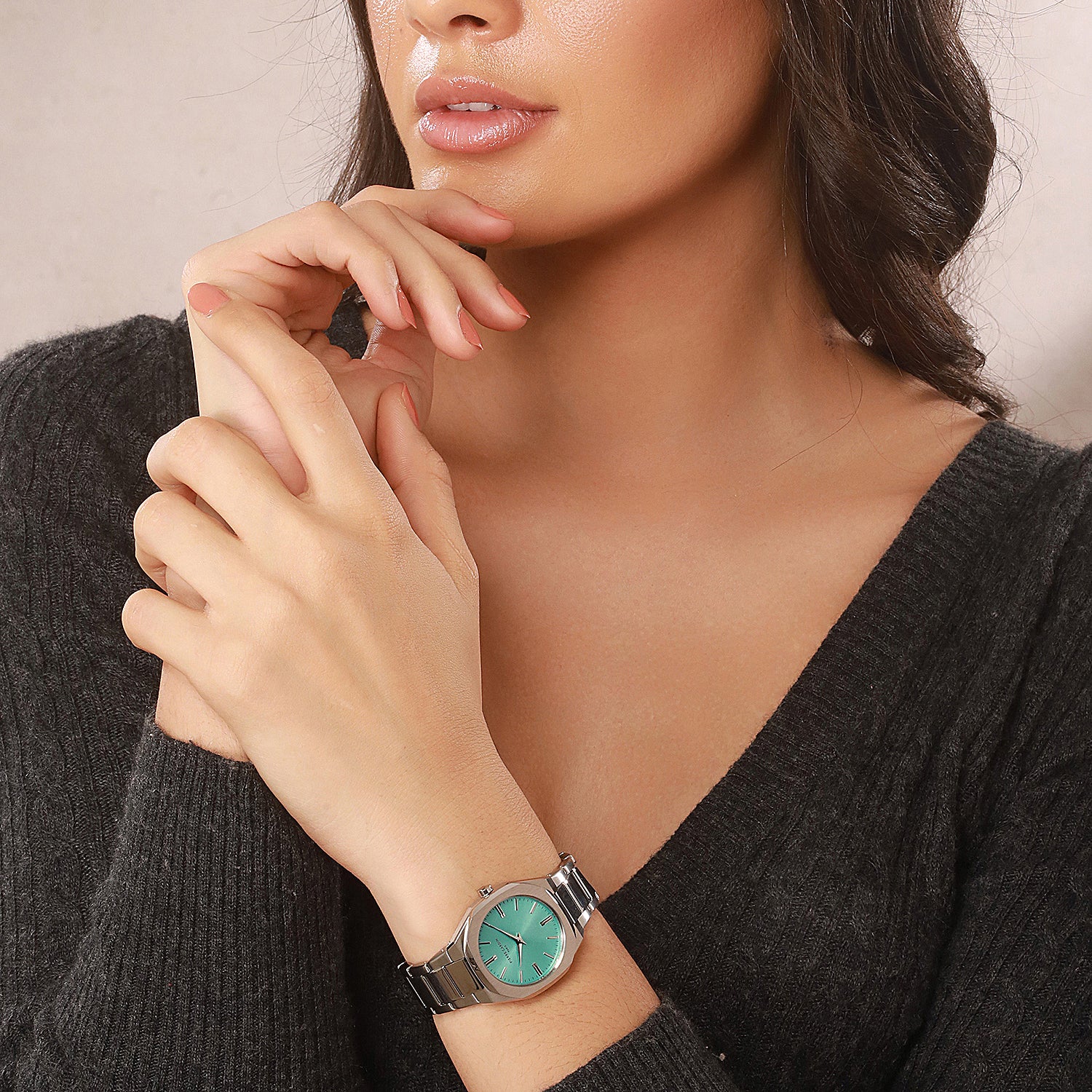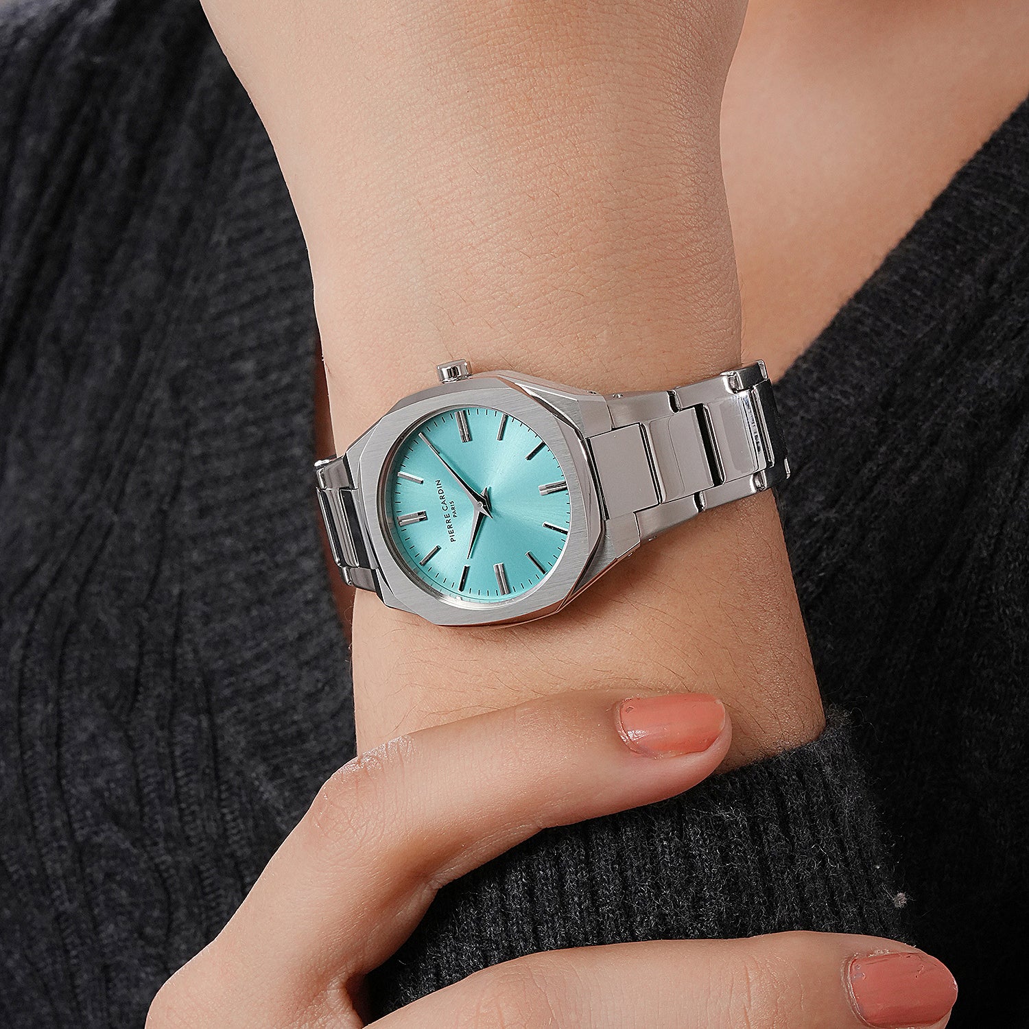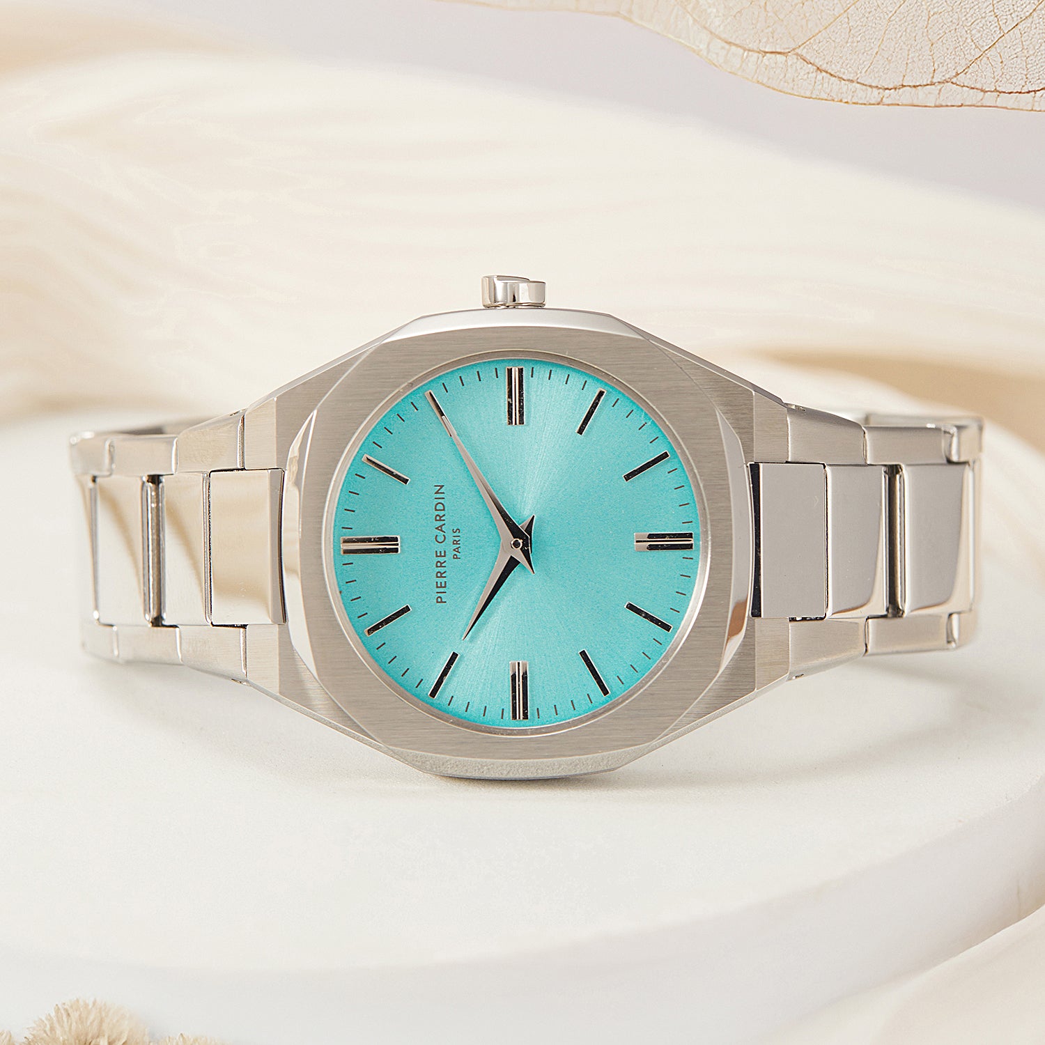 The Élysée Chrysanthème collection by Pierre Cardin brings a fresh, refined elegance to your wrist. Featuring a polished silver case and a stunning Tiffany blue dial with subtle sparkles, this watch captures light and adds a unique touch to any look. With its minimalist two-hand movement and sleek stainless steel band, the Élysée Chrysanthème watch is crafted for the modern woman who values timeless style and Parisian sophistication. Perfect for day or evening wear, it’s a versatile accessory that exudes luxury and charm.