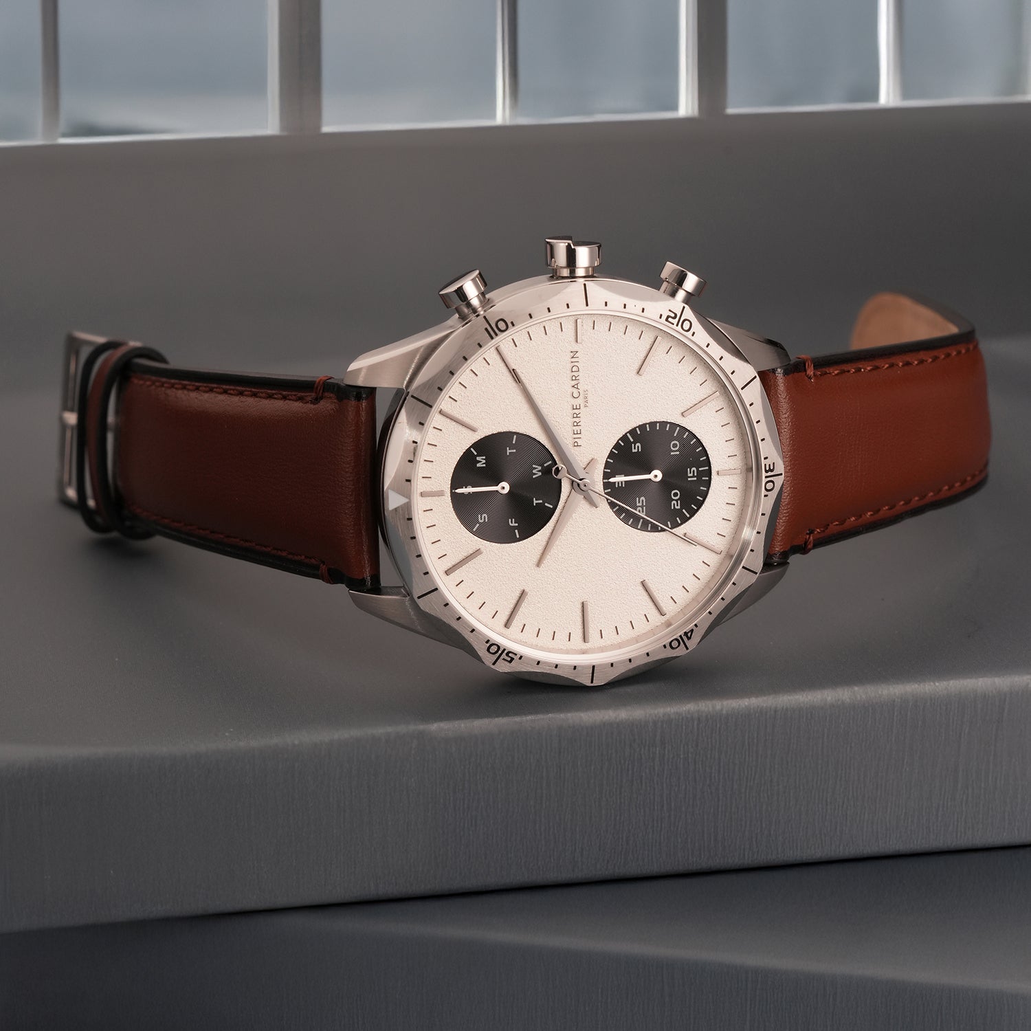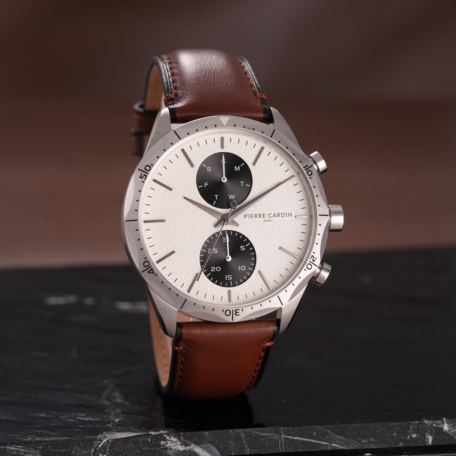 Discover the style and precision of the Heritage RacerTime Men's watch. This 43mm timepiece features a Off white /black dial powered by a Quartz movement from Japan. Encased in Stainless Steel Silver with a Dark Brown Leather Strap, it blends durability with refined elegance. Perfect for those who appreciate craftsmanship and everyday versatility, this watch is a modern statement piece that balances functionality and timeless appeal.