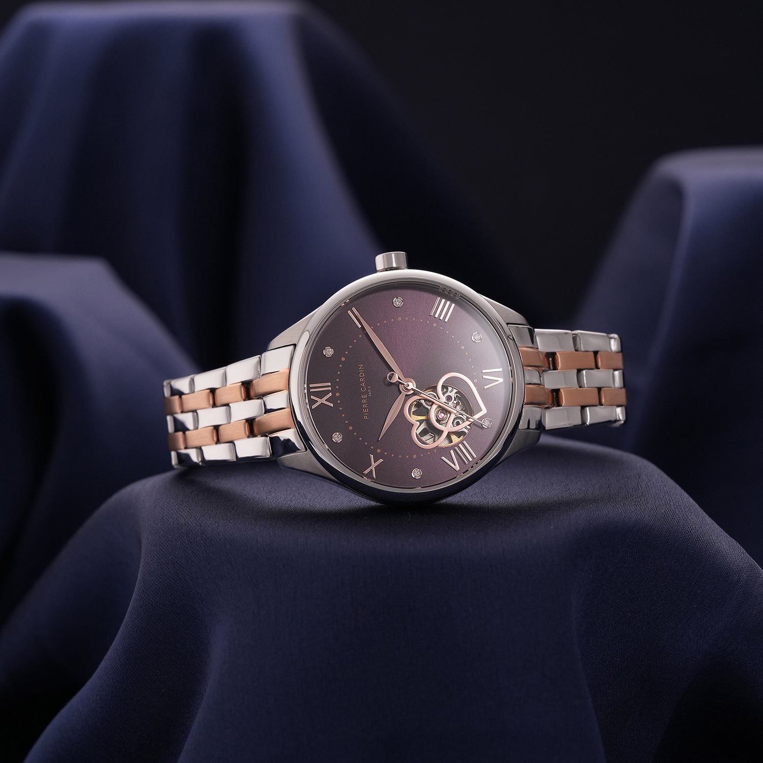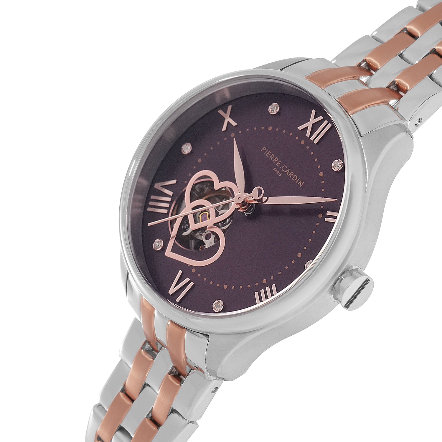 Mécanique Élégante Lady 34.5mm - Stainless steel with Twotone Rose Gold and Silver Metal Strap offers a distinct design identity and refined detailing tailored for its signature look. This 34.5mm timepiece features a Purple brown  dial powered by a Mechnical automatic movement from China. Encased in Stainless steel with a Twotone Rose Gold and Silver Metal Strap, it blends durability with refined elegance. Perfect for those who appreciate craftsmanship and everyday versatility, this watch is a modern statement piece that balances functionality and timeless appeal.