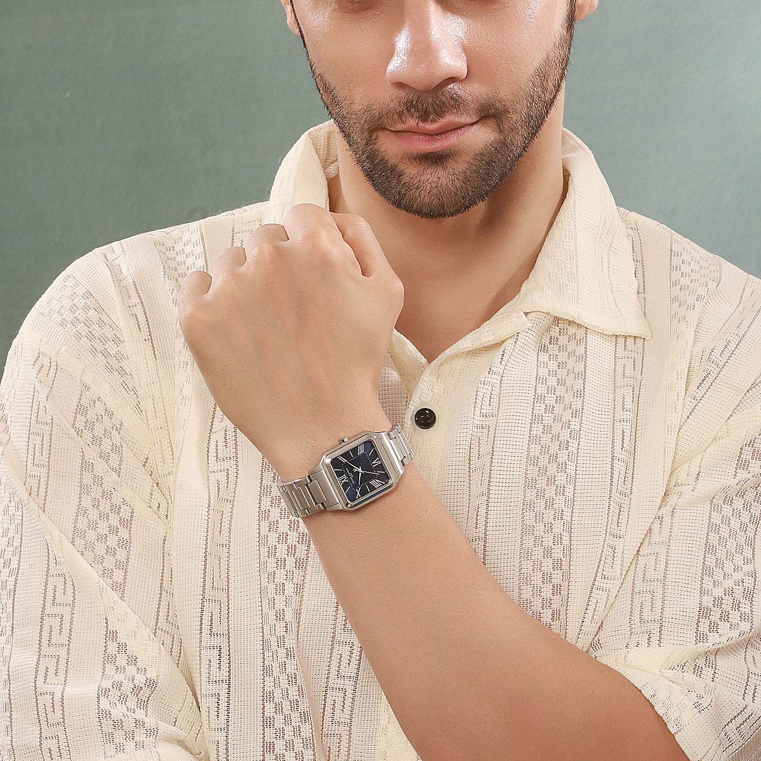 Ménilmontant Carré Men’s Square Watch - Silver Case, Blue Dial with Silver Metal Strap