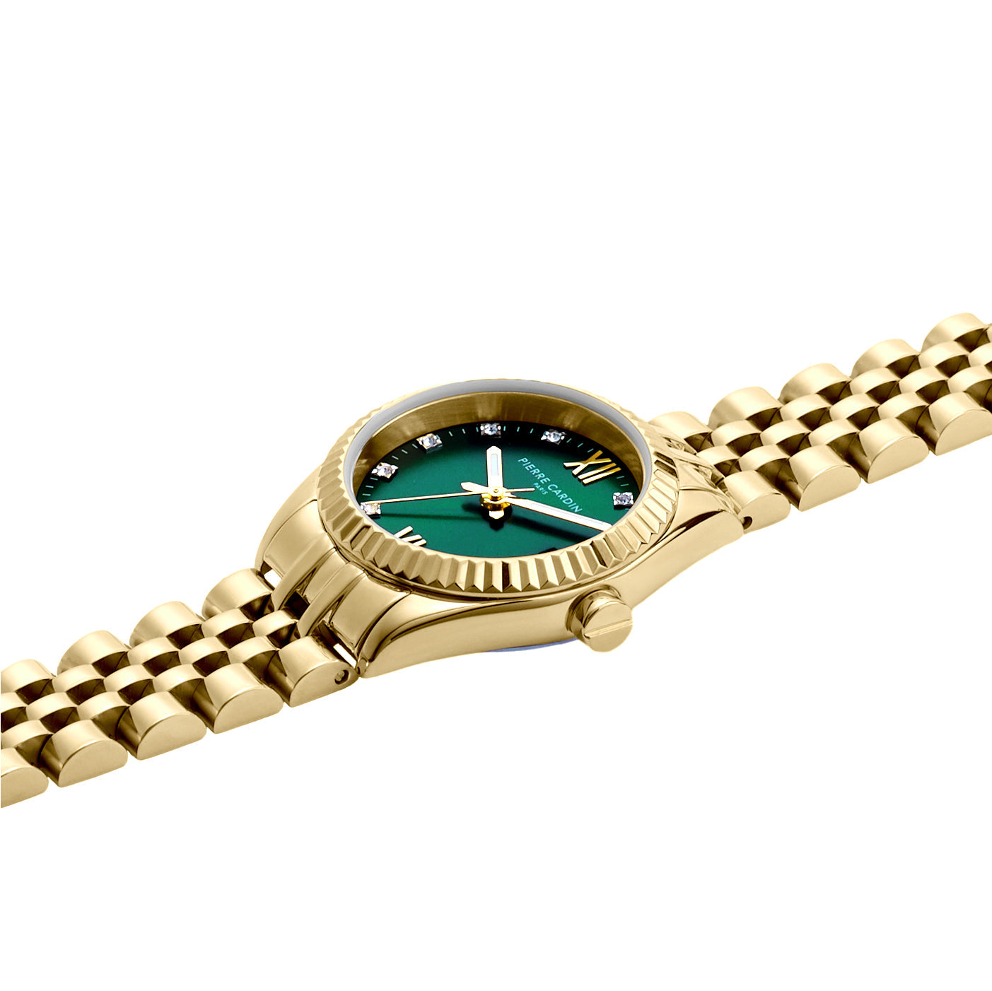 Opera Gold Date Watch with Fluted Bezel and Crystals on a Green Dial