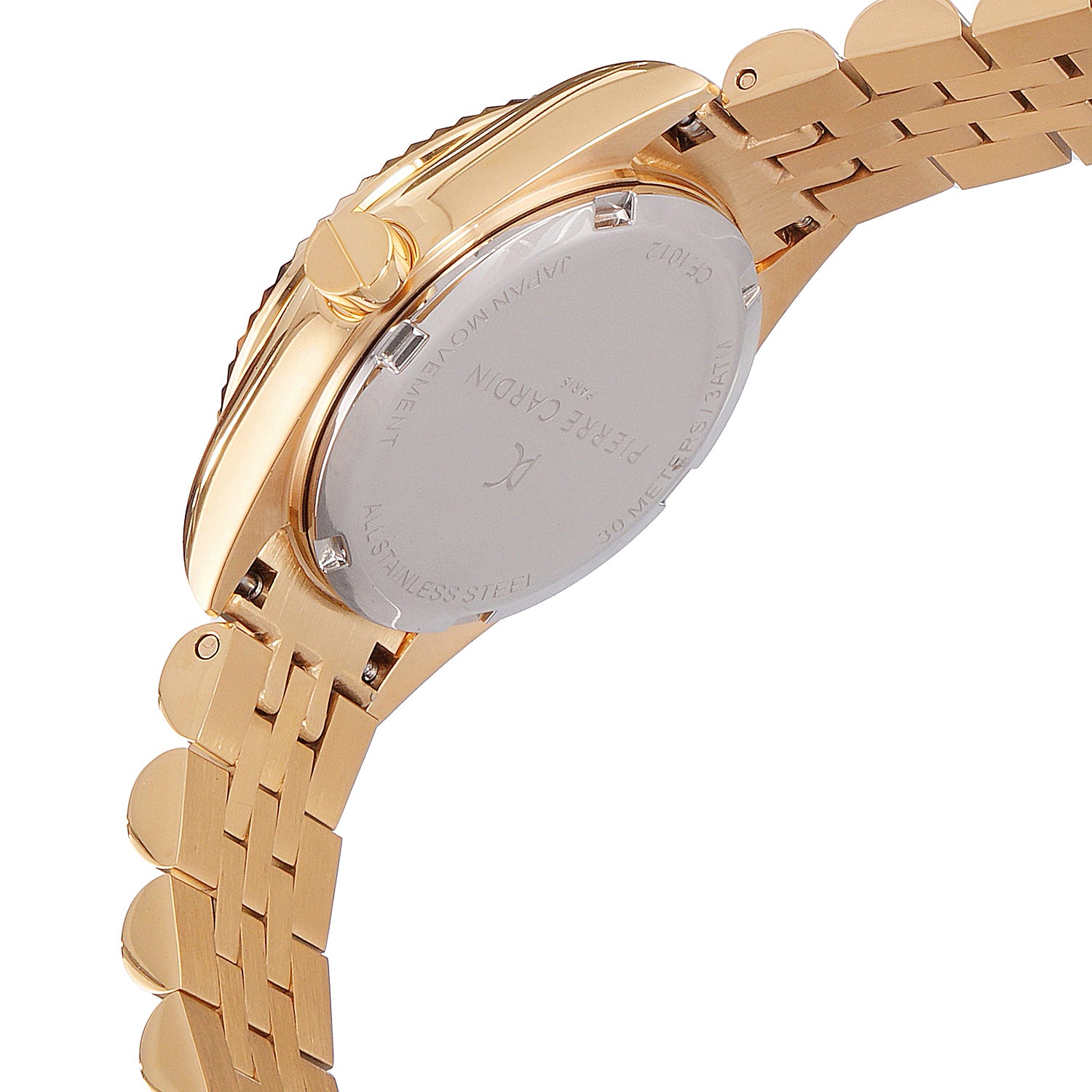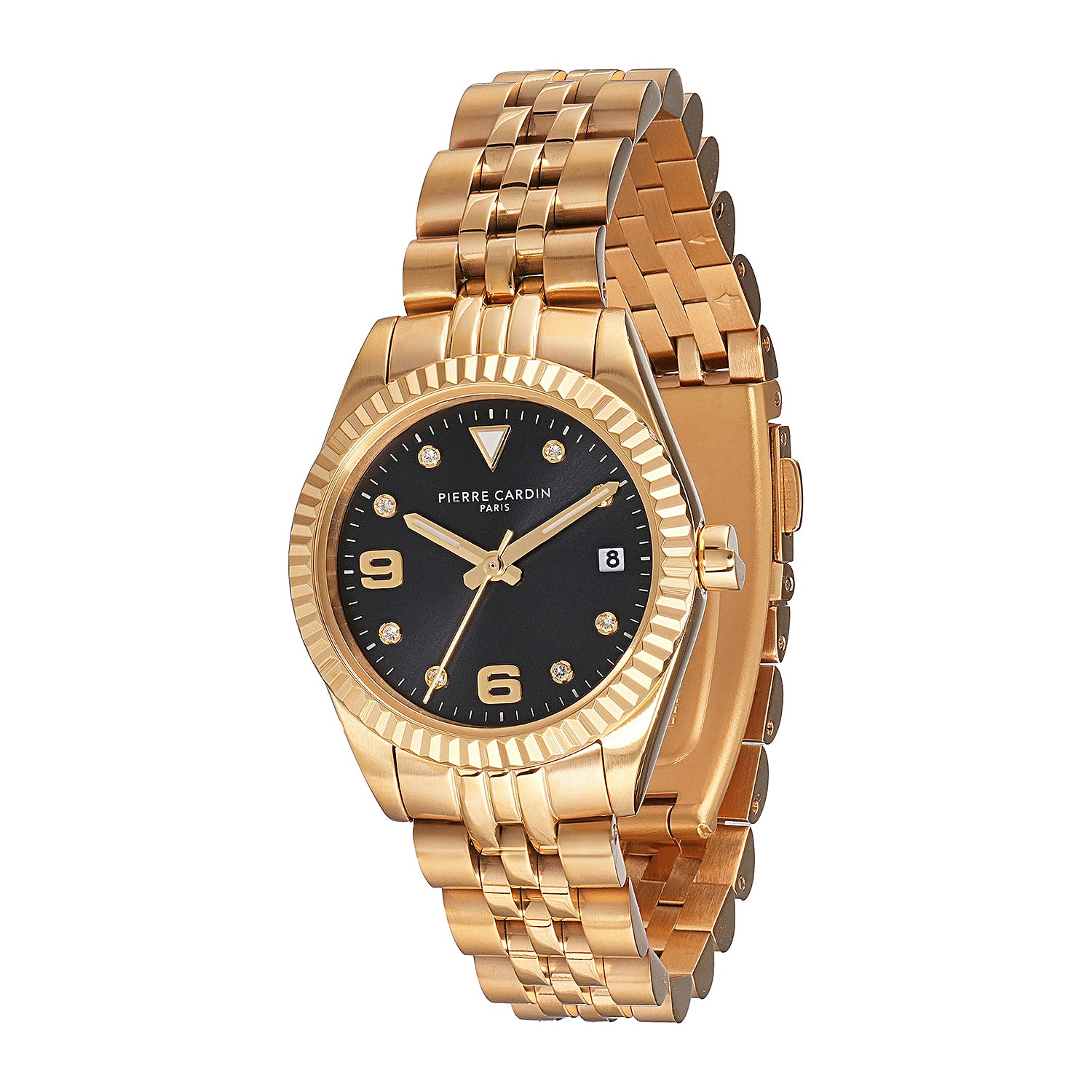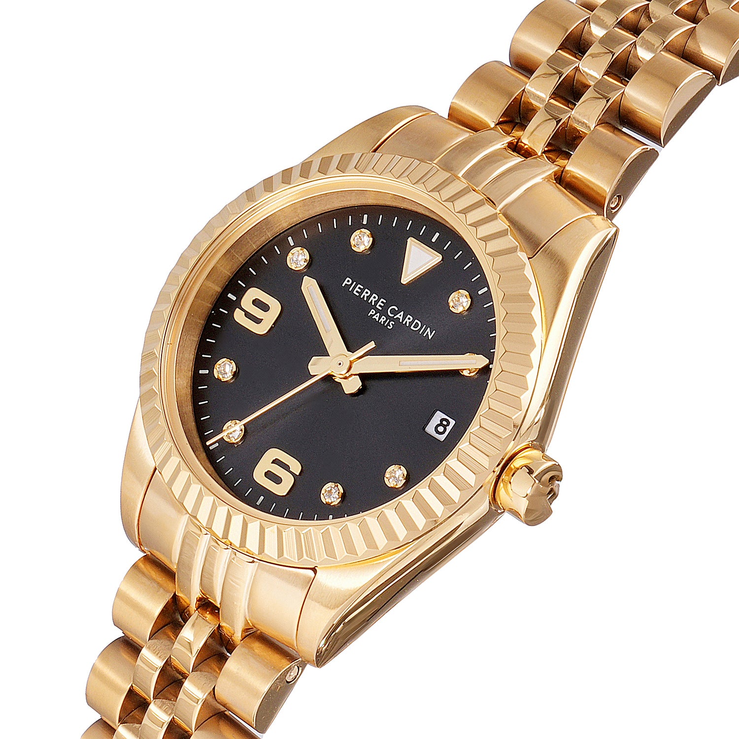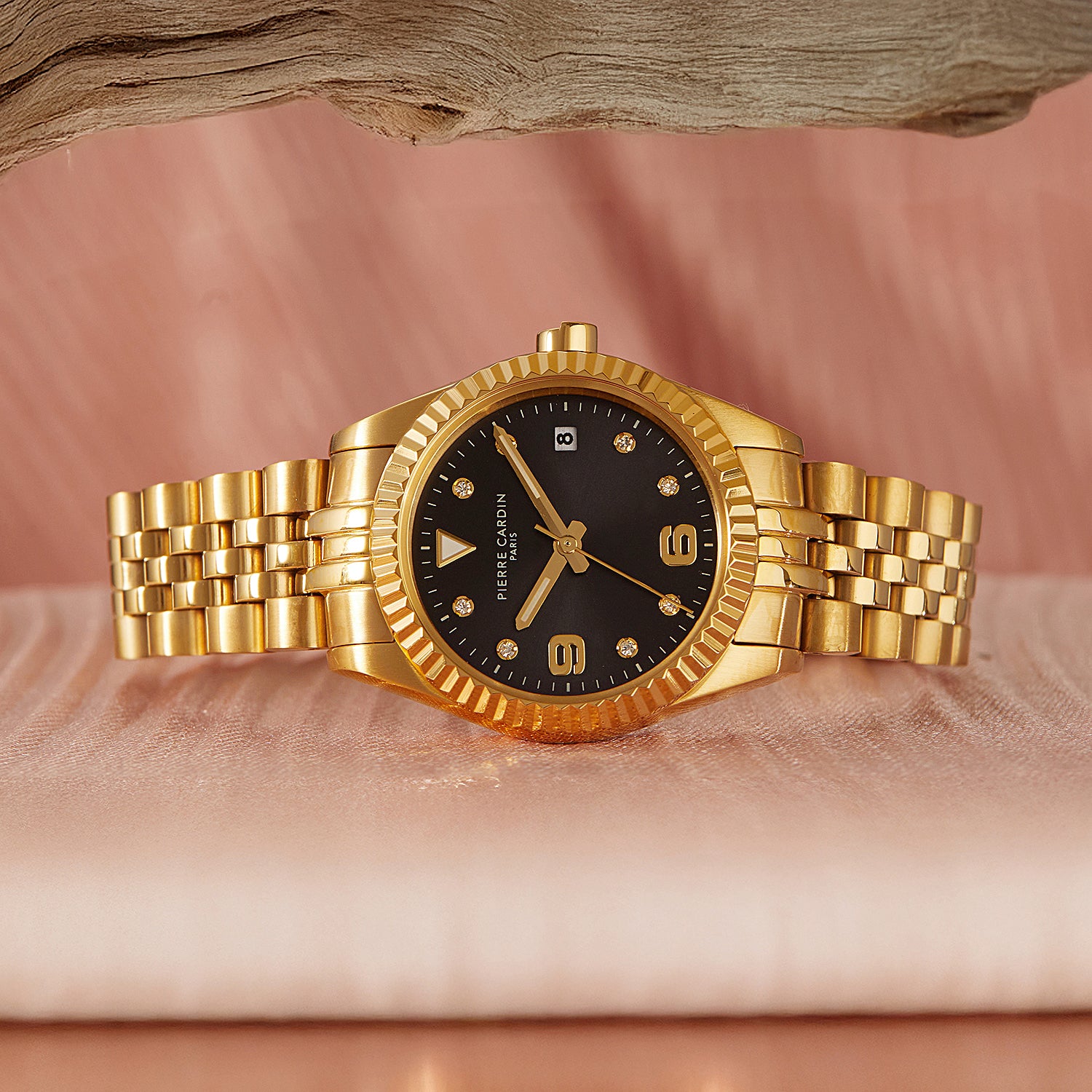 The Opéra Timbre women’s watch by Pierre Cardin is a bold and sophisticated timepiece designed for the modern woman. Featuring a radiant gold case and a sleek black dial adorned with sparkling crystal indexes and matching gold hands, this watch is the epitome of timeless elegance. Paired with a luxurious gold Jubilee strap, it is powered by a precise 3-hand quartz movement and includes a convenient date display. Perfect for any occasion, the Opéra Timbre watch combines Parisian charm with exceptional craftsmanship, making it a standout accessory in any wardrobe.