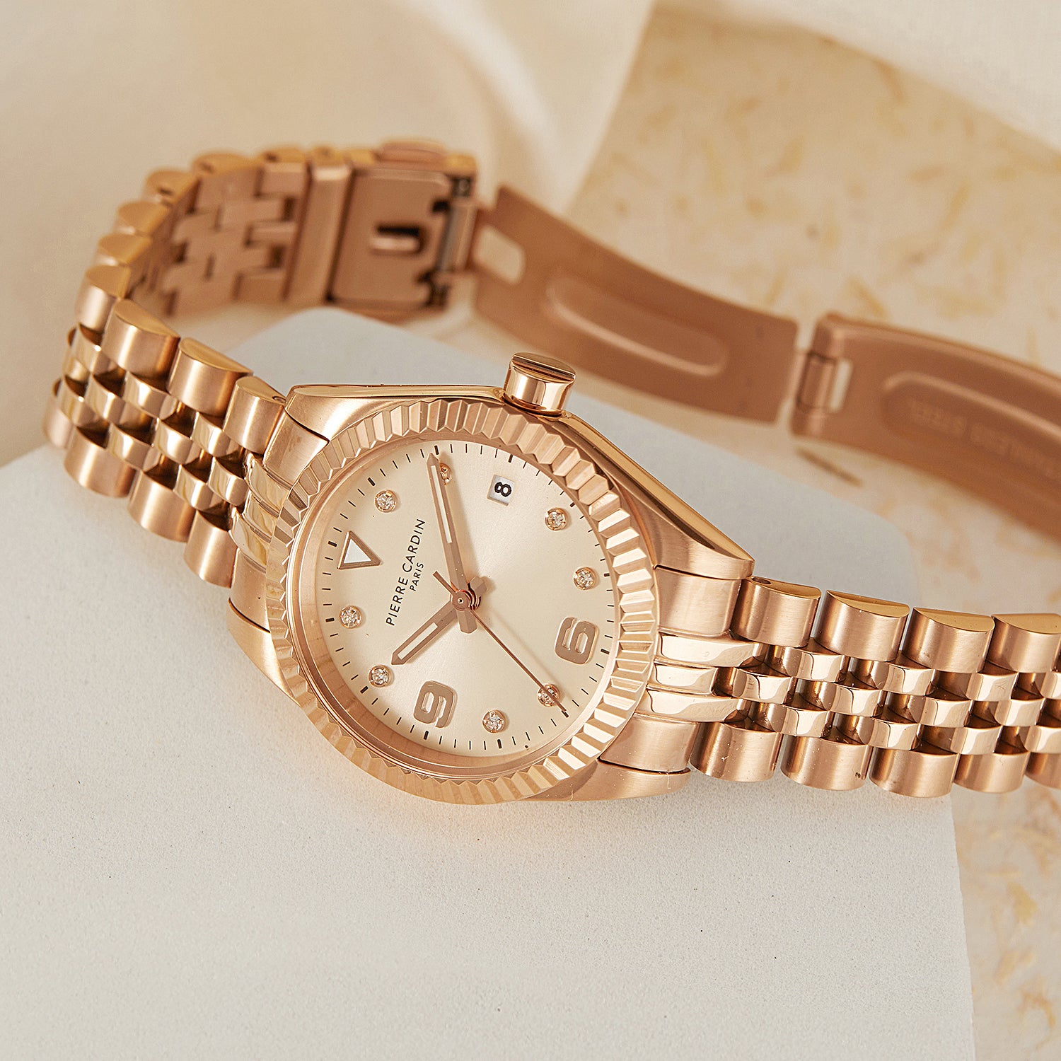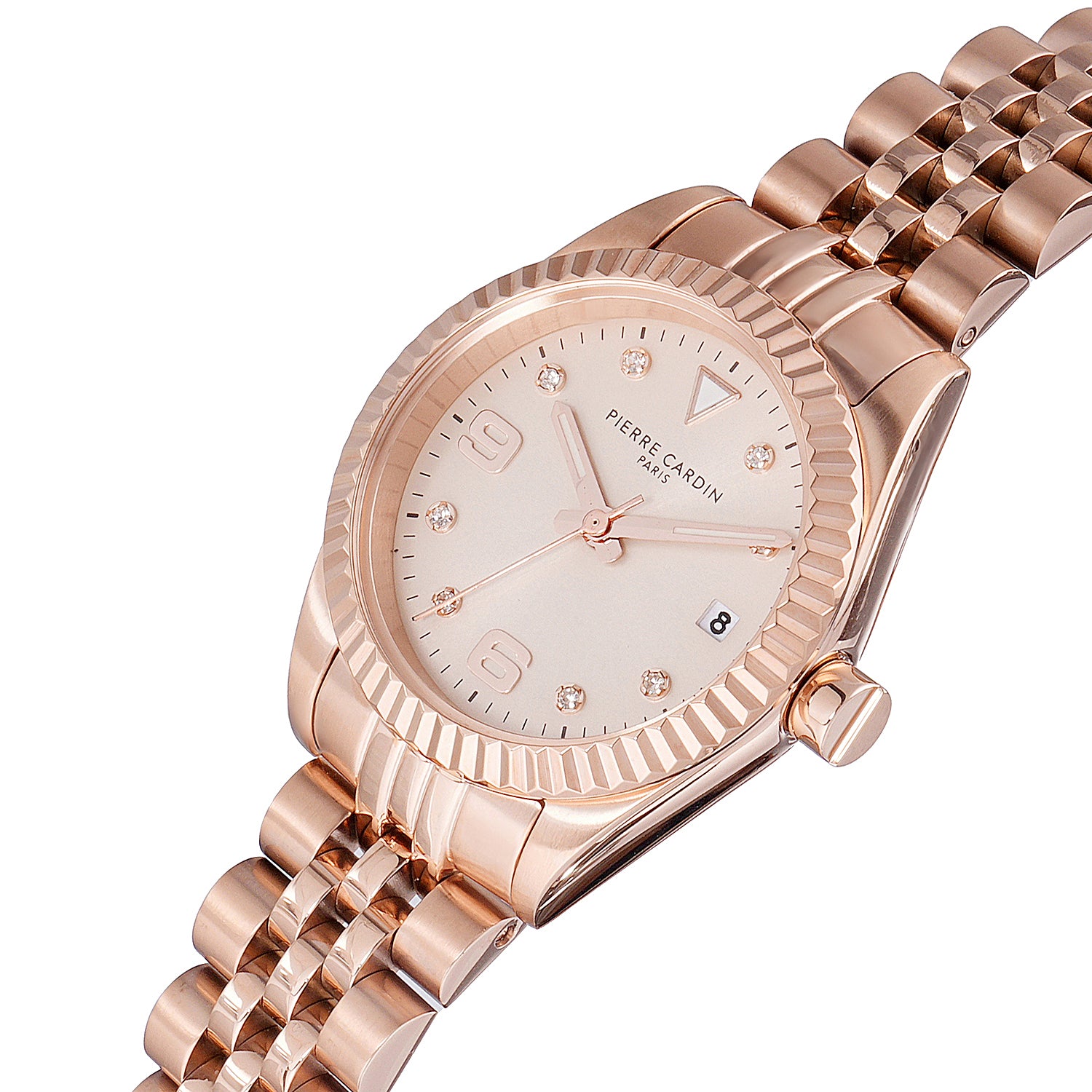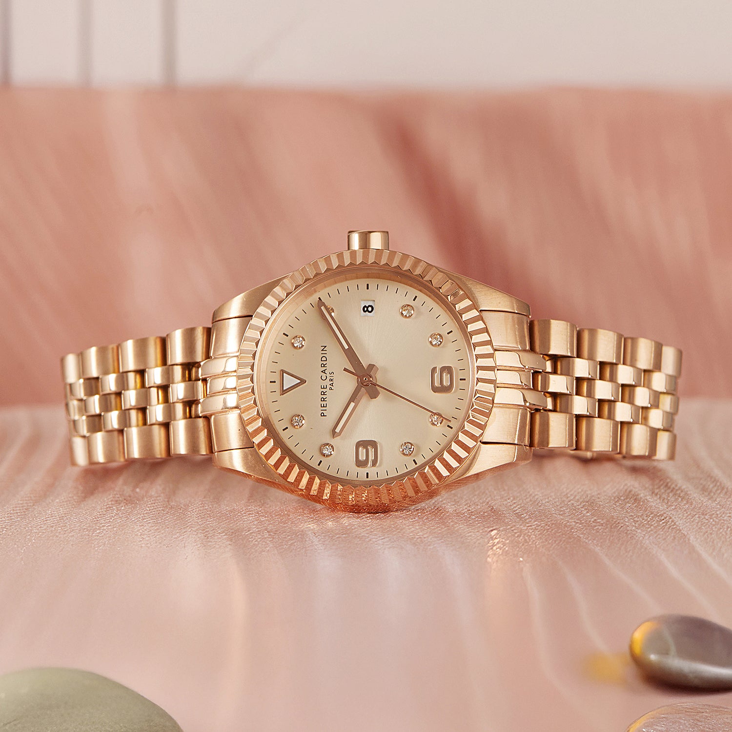 The Opéra Timbre women’s watch by Pierre Cardin radiates elegance and luxury with its sophisticated design. Featuring a radiant rose gold case, this stunning timepiece is complemented by a warm champagne dial adorned with sparkling crystal indexes and elegant rose gold hands. Paired with a luxurious rose gold Jubilee strap, it is powered by a precise 3-hand quartz movement and includes a convenient date display. Perfect for the modern woman, the Opéra Timbre watch combines timeless Parisian style with impeccable craftsmanship, making it a standout accessory for any occasion.