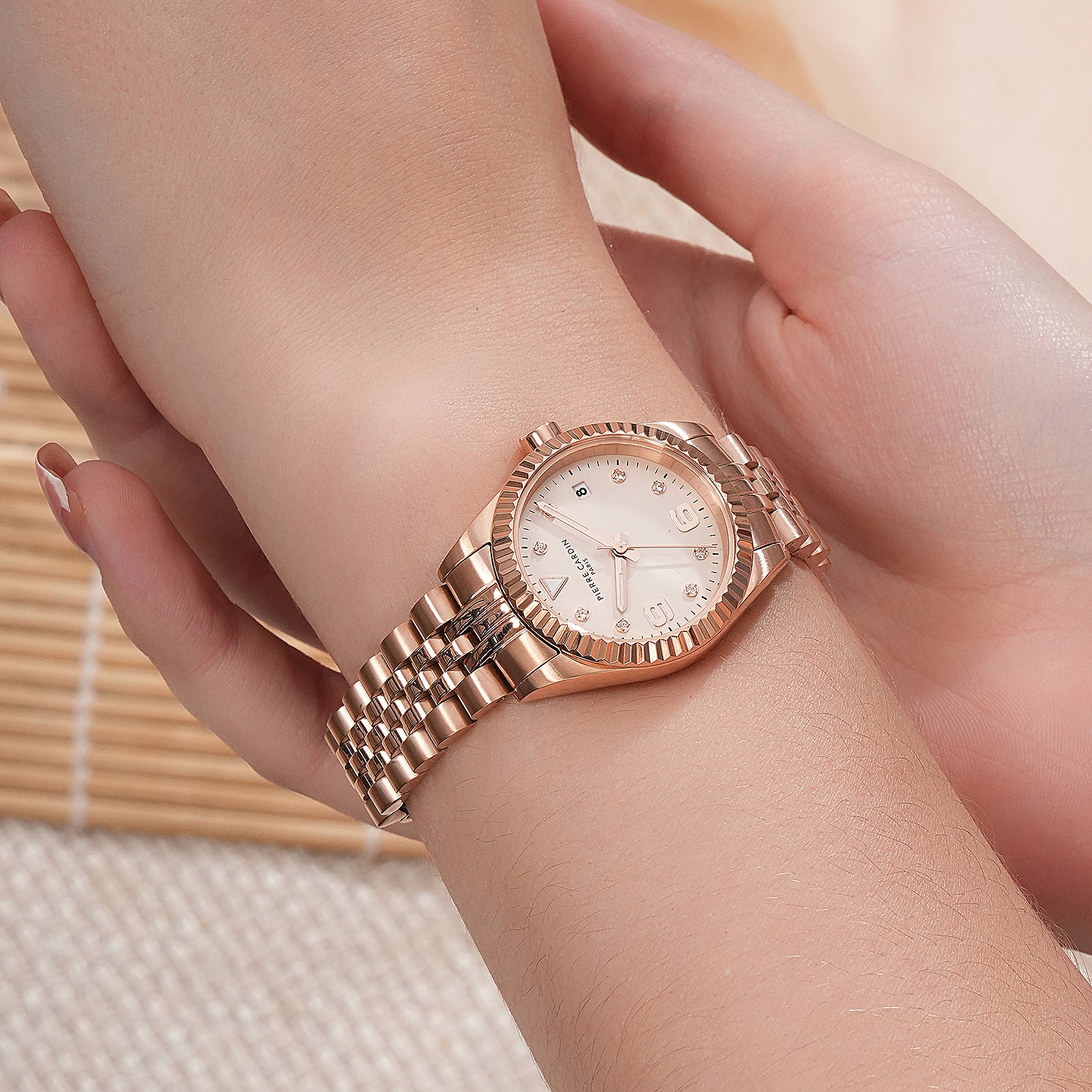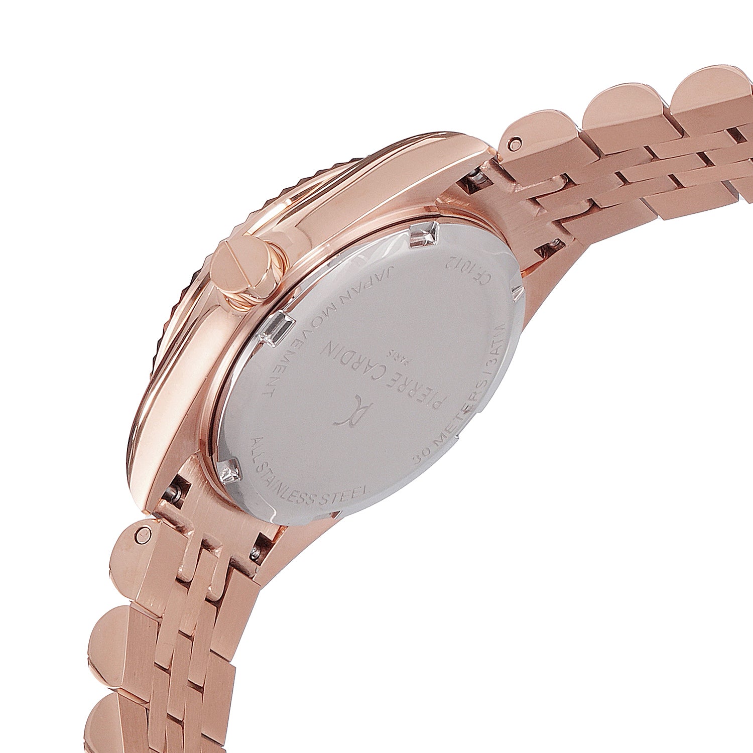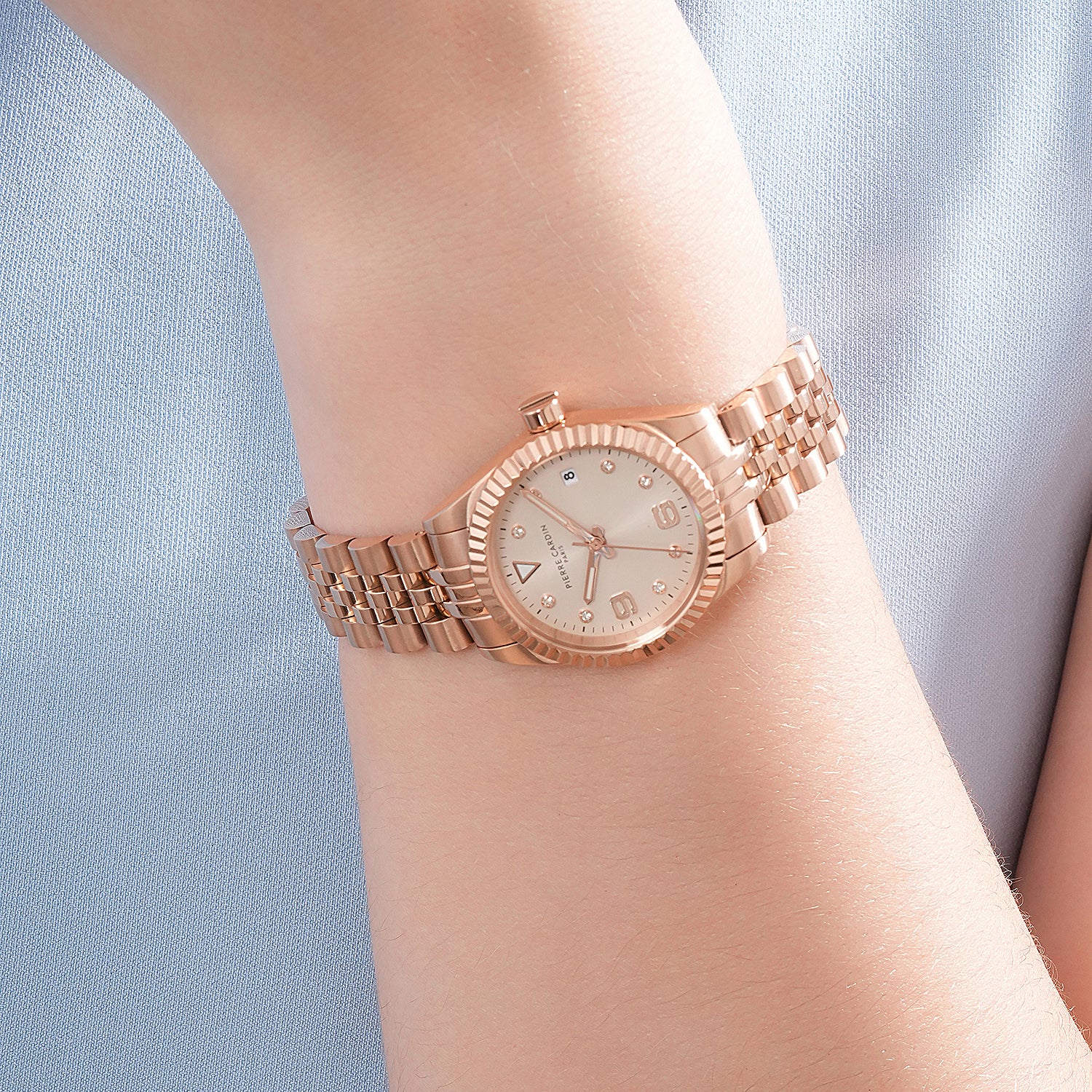 The Opéra Timbre women’s watch by Pierre Cardin radiates elegance and luxury with its sophisticated design. Featuring a radiant rose gold case, this stunning timepiece is complemented by a warm champagne dial adorned with sparkling crystal indexes and elegant rose gold hands. Paired with a luxurious rose gold Jubilee strap, it is powered by a precise 3-hand quartz movement and includes a convenient date display. Perfect for the modern woman, the Opéra Timbre watch combines timeless Parisian style with impeccable craftsmanship, making it a standout accessory for any occasion.