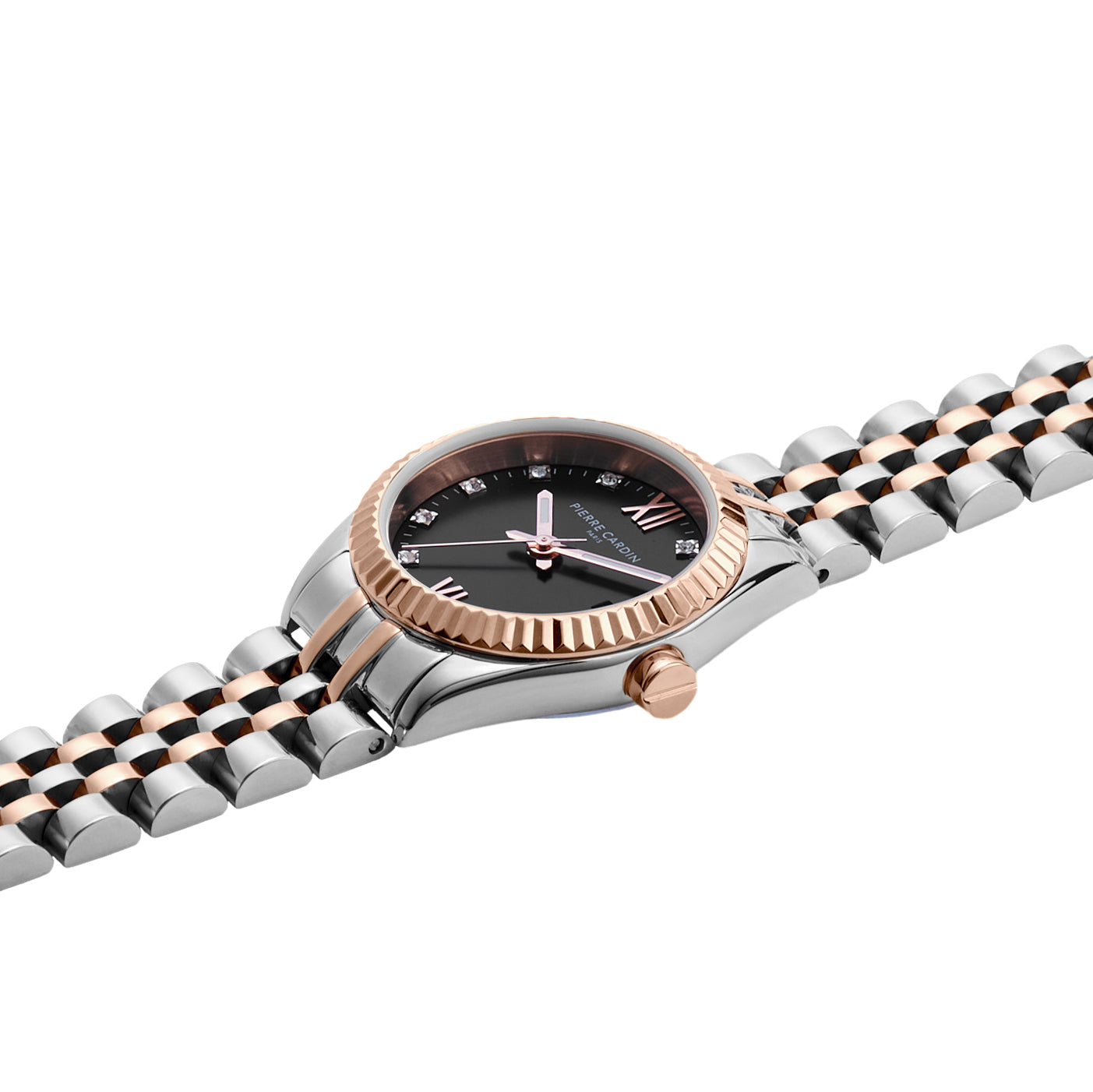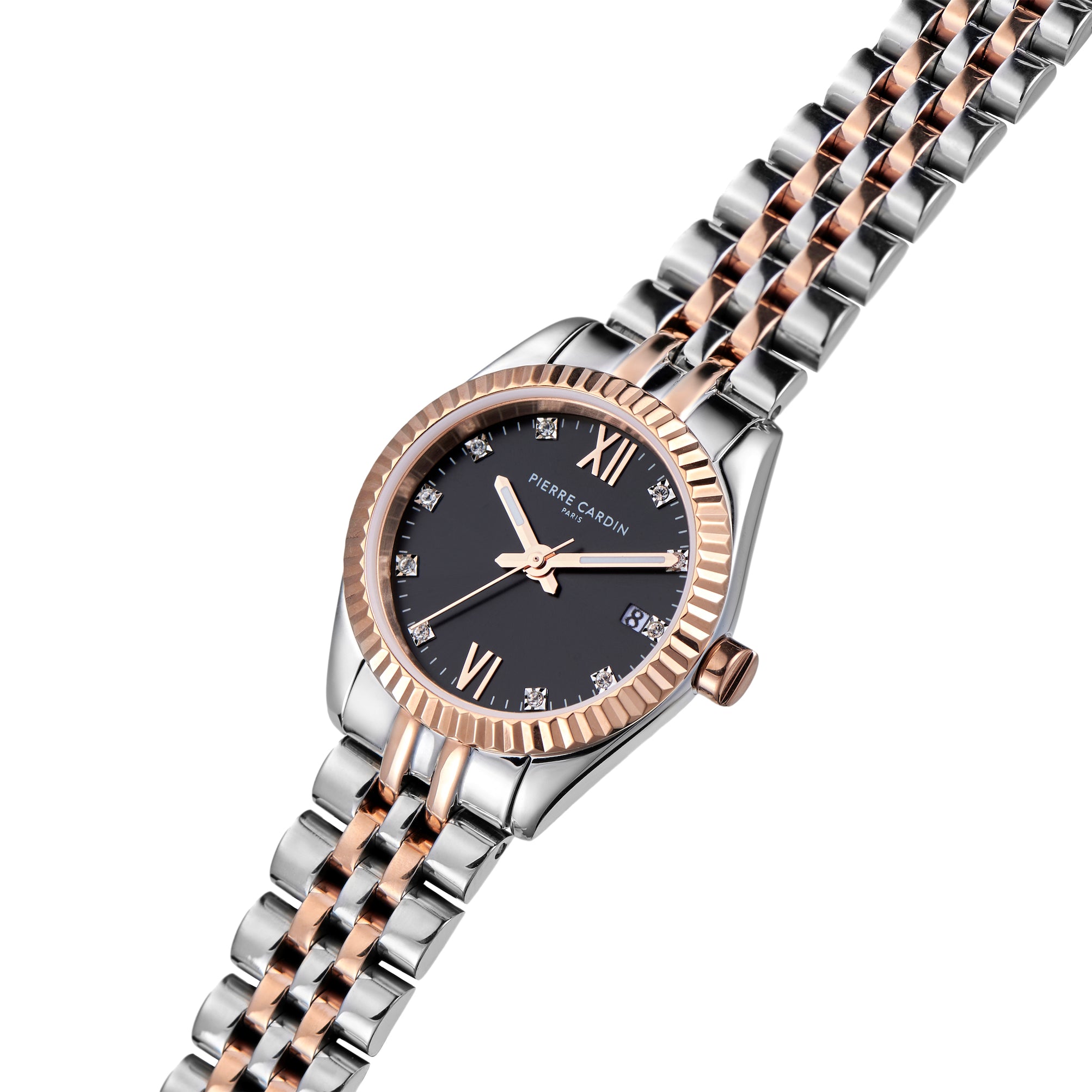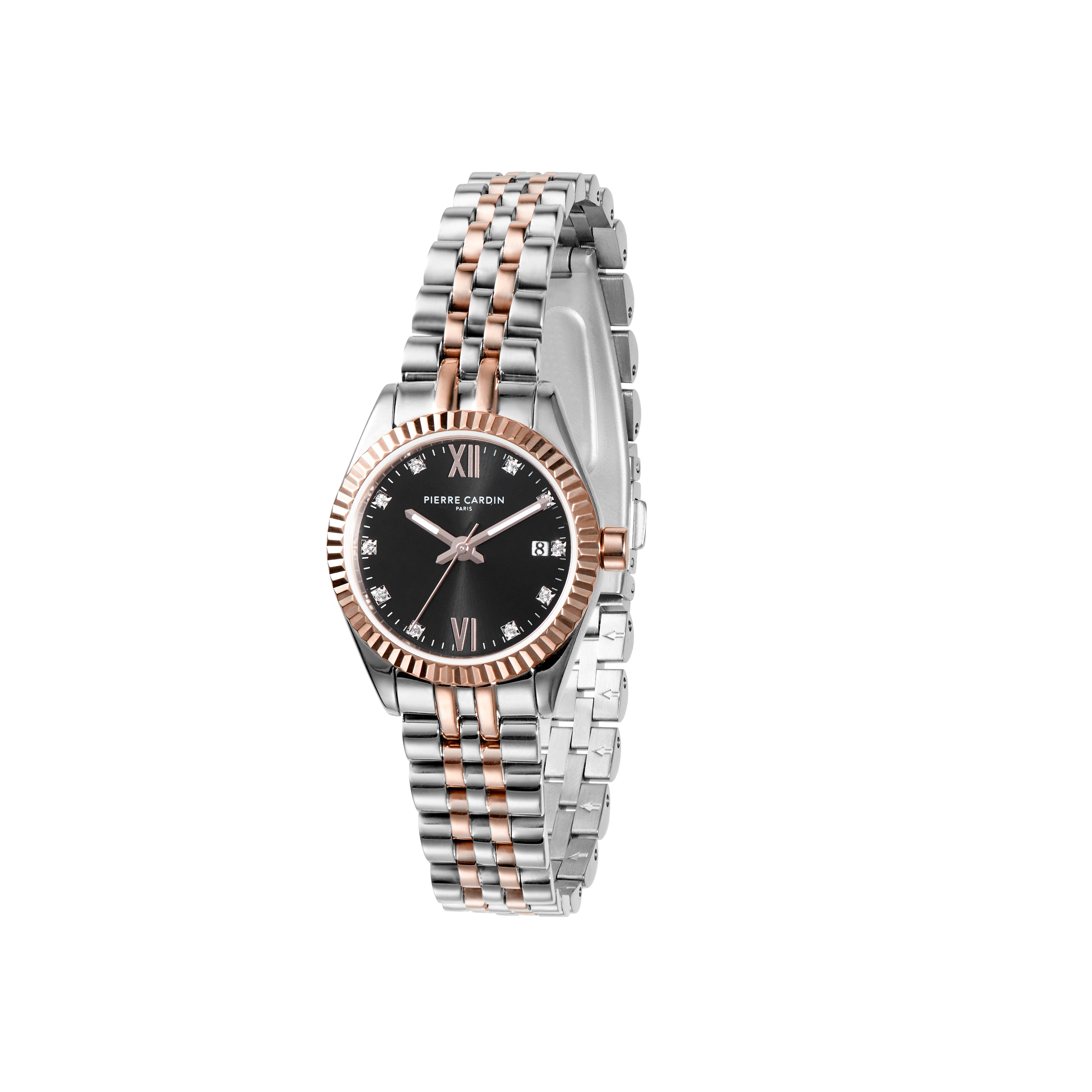 Just like the elegant Opera region of Paris which is known for its theaters, this Pierre Cardin watch is elegant and mesmerising. The fluted bezel adds a touch of luxury, this beautiful watch is made in two tone rose gold and stainless steel with black dial and Crystals on indexes. The watch also features a date function. The flawless stainless steel watch case lends a delicate and matching two tone gold and stainless steel metal link watch strap adds an additional hint of classic luxury.