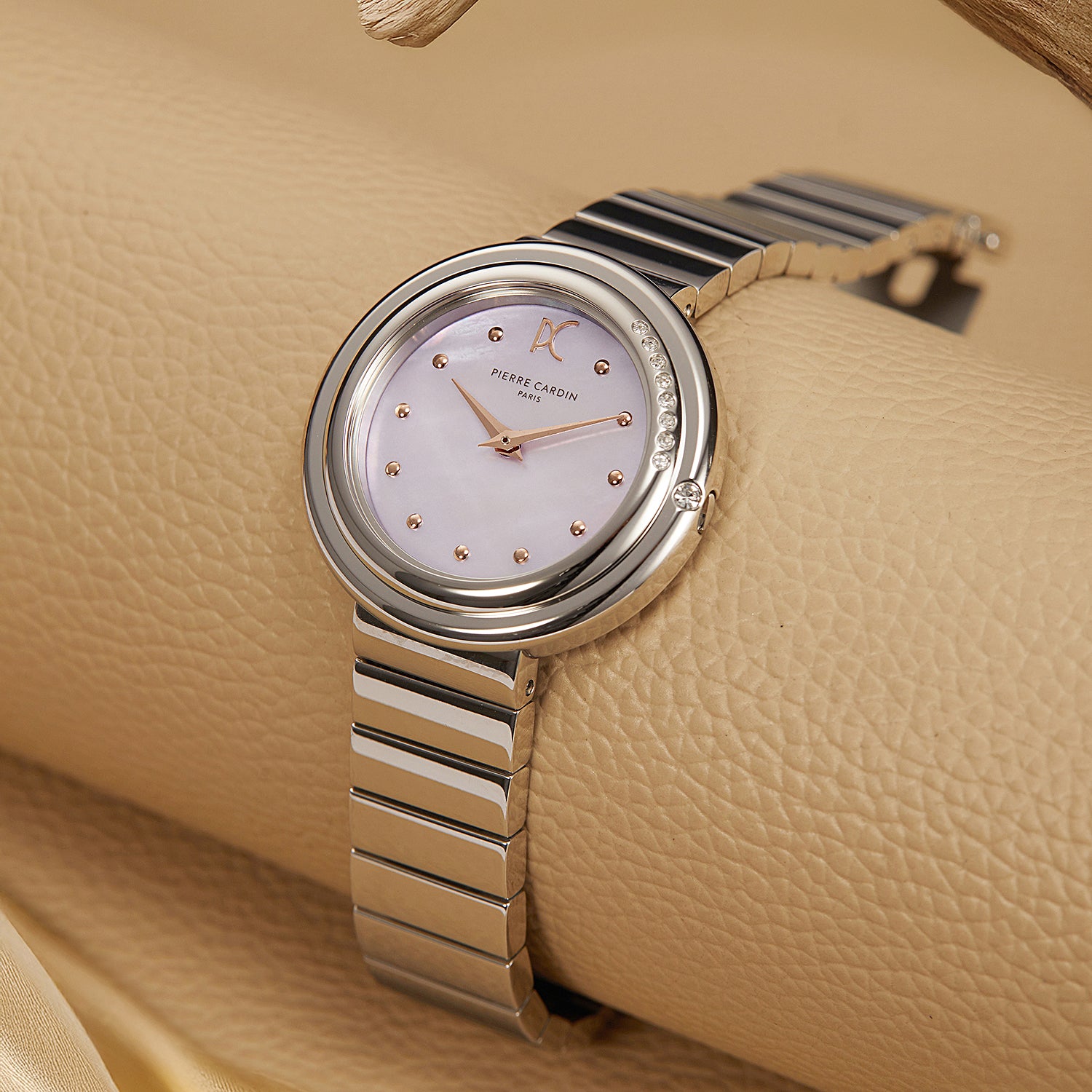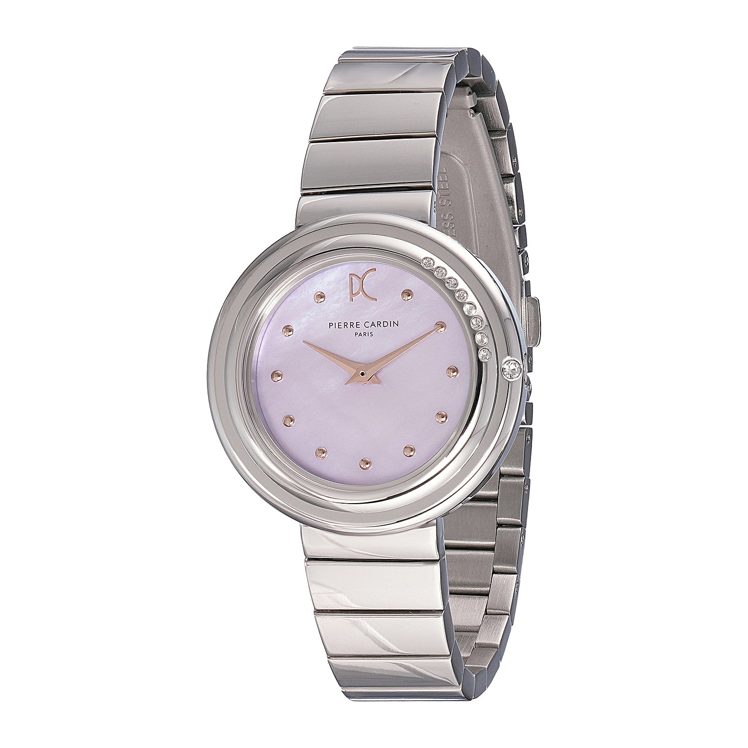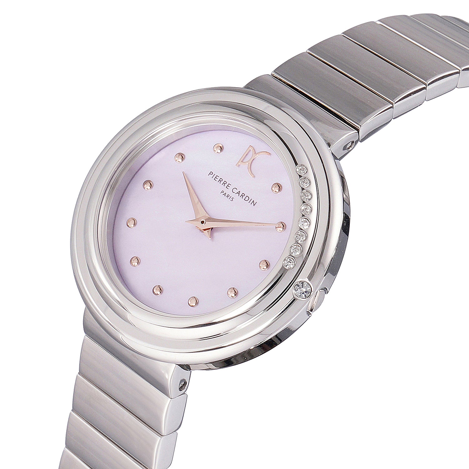 The Passy Météore collection by Pierre Cardin combines timeless elegance with a modern flair. This stunning 32mm ladies’ watch features a polished silver case, a dazzling crystal-adorned bezel, and a soft pink mother of pearl dial accented with shimmering crystals. Paired with a unique metal link strap, this timepiece offers a refined yet contemporary look. The hidden crown enhances its clean, seamless design, while the precise two-hand quartz movement ensures reliable performance. Perfect for any occasion, the Passy Météore watch embodies Parisian sophistication and exquisite craftsmanship.