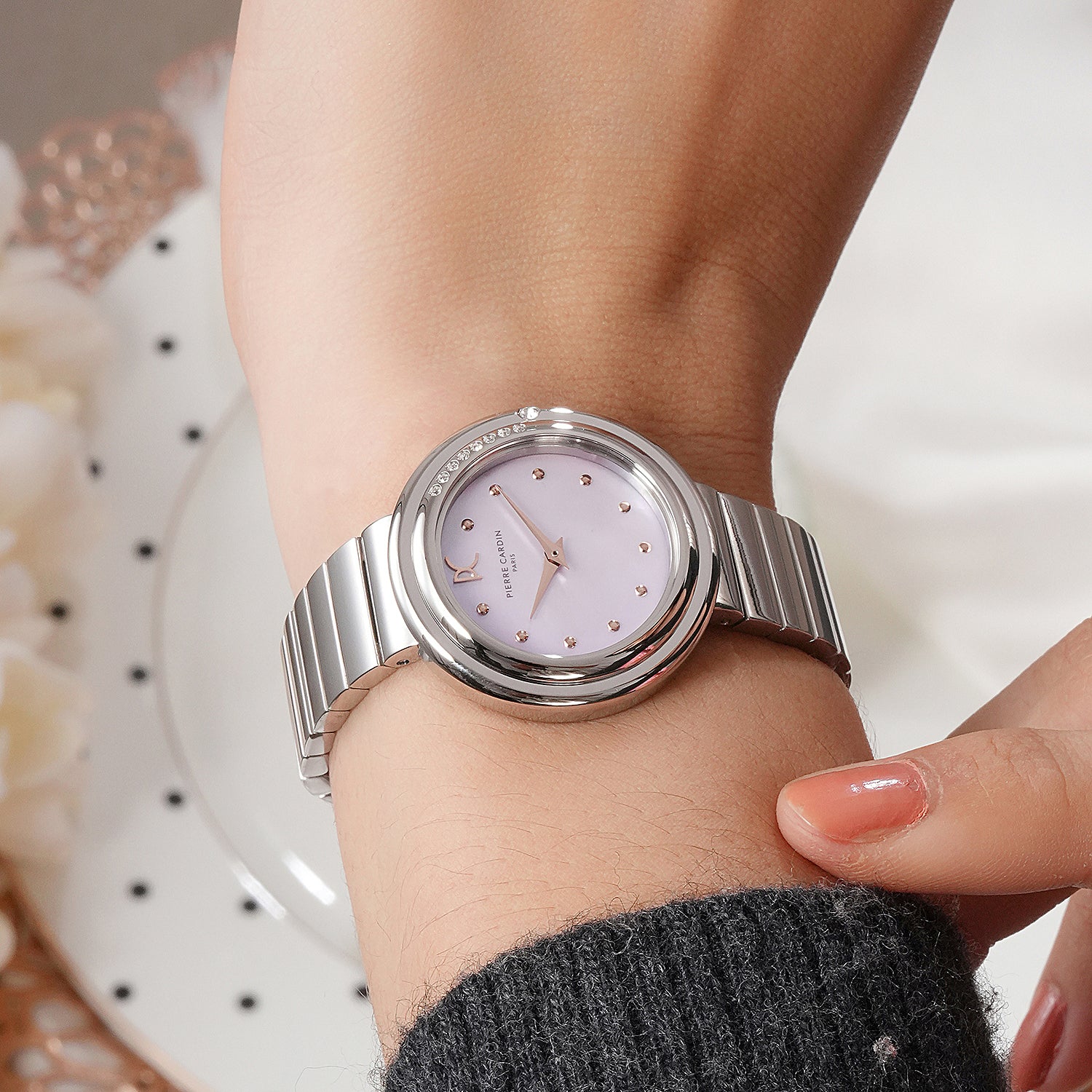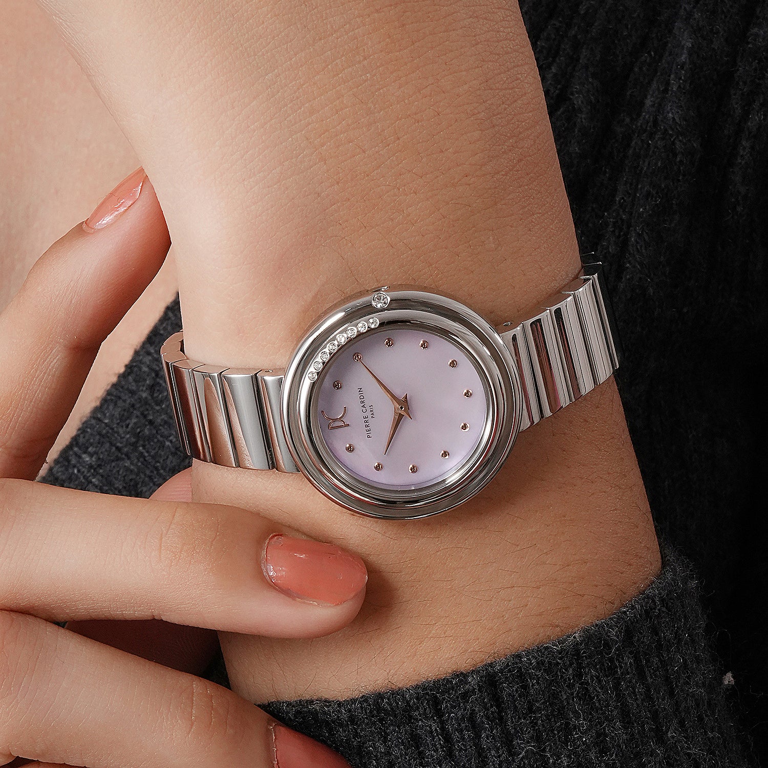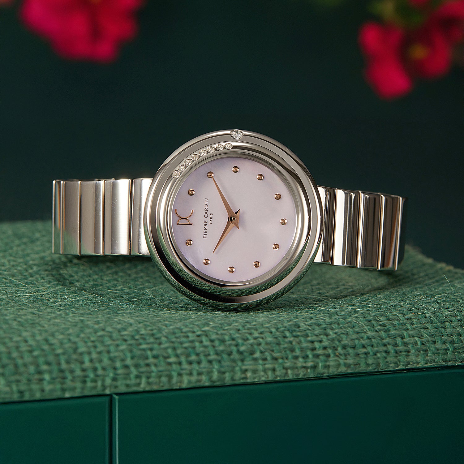 The Passy Météore collection by Pierre Cardin combines timeless elegance with a modern flair. This stunning 32mm ladies’ watch features a polished silver case, a dazzling crystal-adorned bezel, and a soft pink mother of pearl dial accented with shimmering crystals. Paired with a unique metal link strap, this timepiece offers a refined yet contemporary look. The hidden crown enhances its clean, seamless design, while the precise two-hand quartz movement ensures reliable performance. Perfect for any occasion, the Passy Météore watch embodies Parisian sophistication and exquisite craftsmanship.