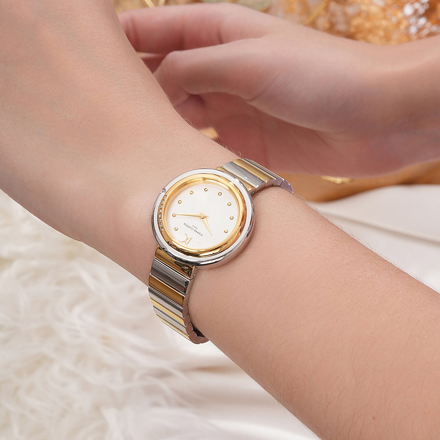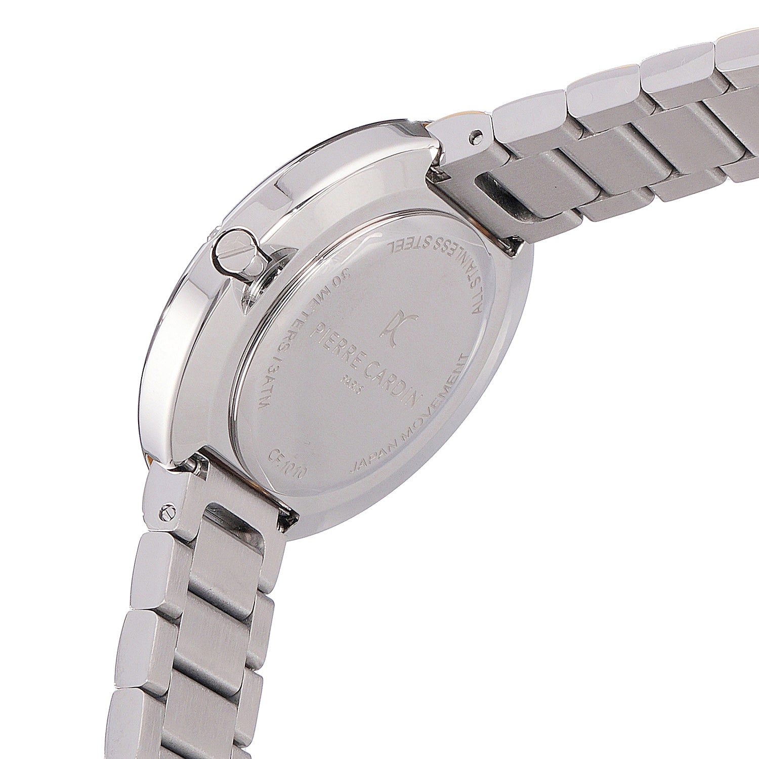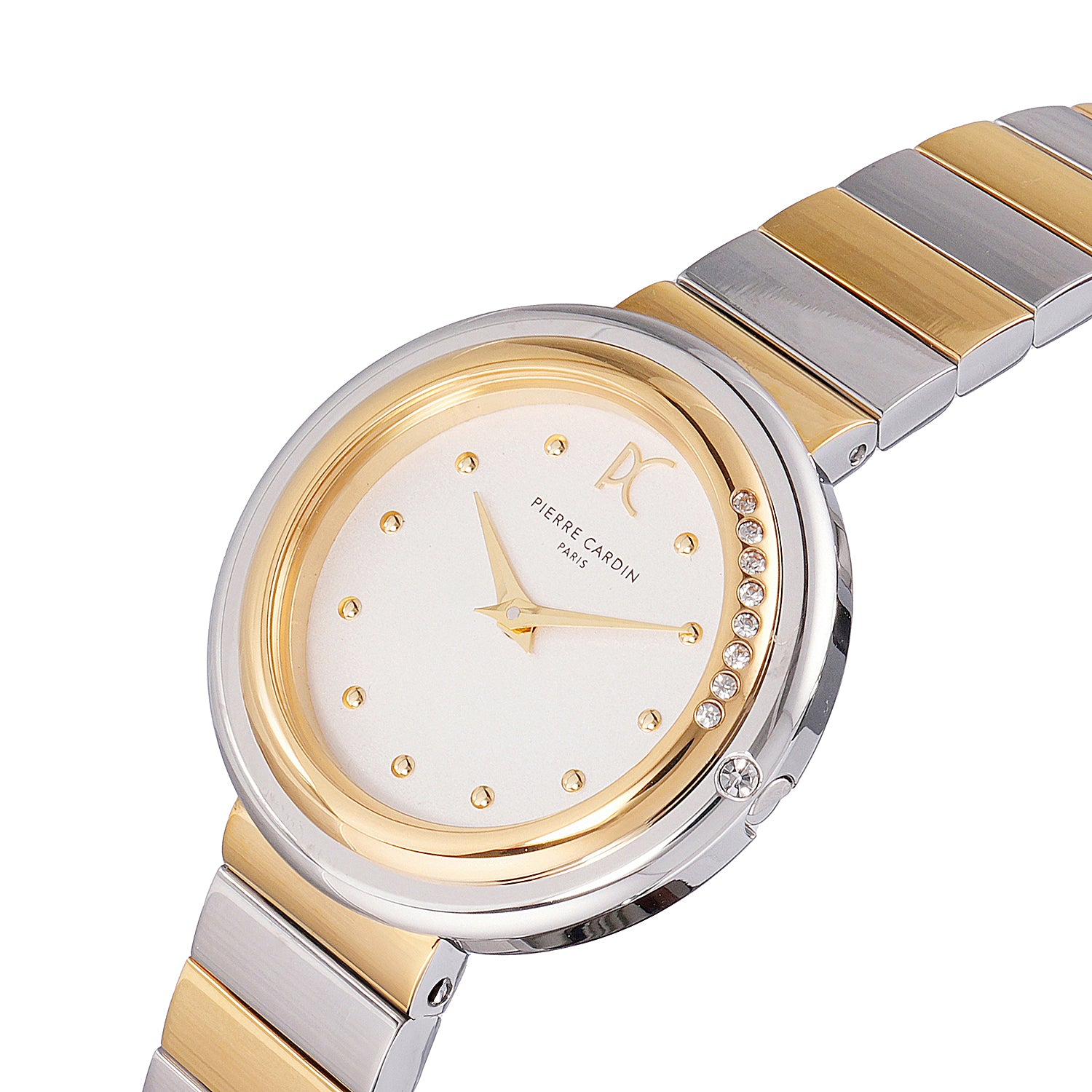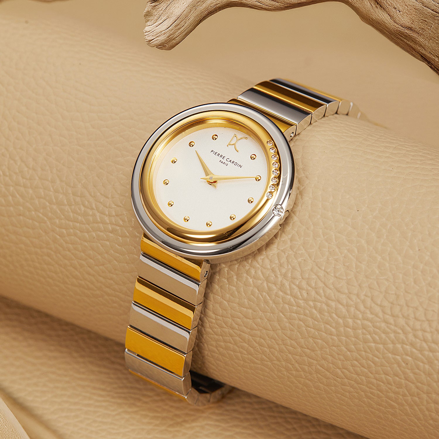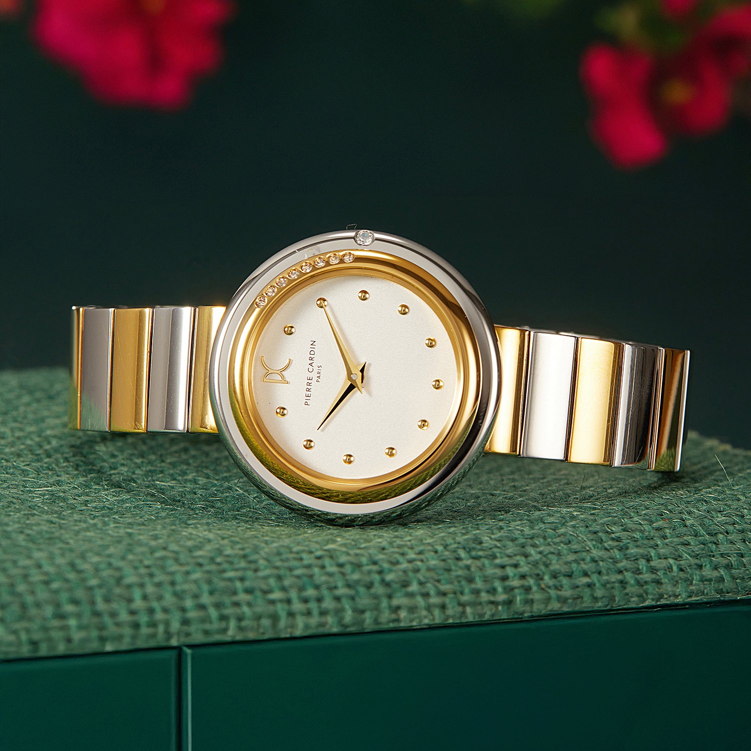 The Passy Météore collection by Pierre Cardin radiates timeless Parisian elegance and sophistication. This exquisite 32mm ladies’ watch features a refined two-tone gold and silver case, a sparkling crystal-adorned bezel, and a luminous silver white dial accented with crystals. Its unique metal link strap adds a contemporary edge, while the hidden crown ensures a sleek, clean design. Powered by a precise two-hand quartz movement, the Passy Météore watch is the ideal accessory for women who value luxury and classic style.