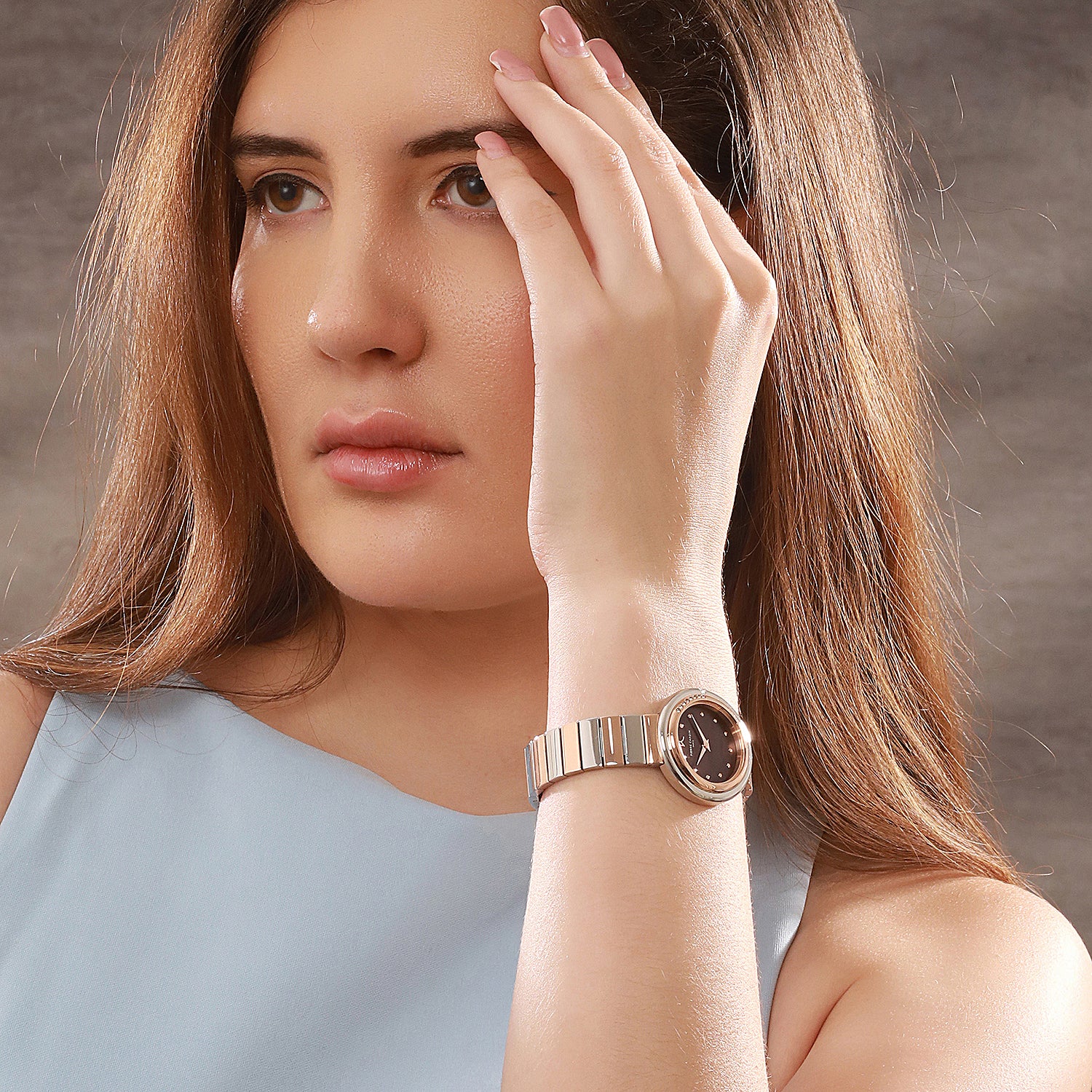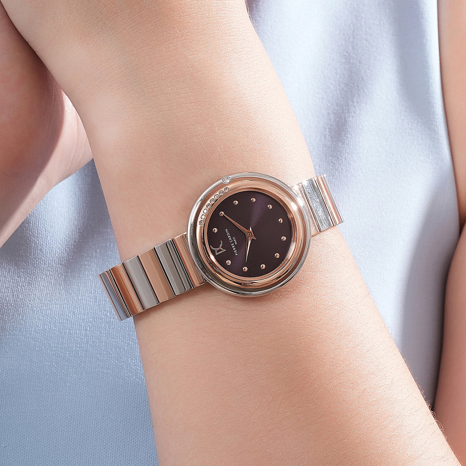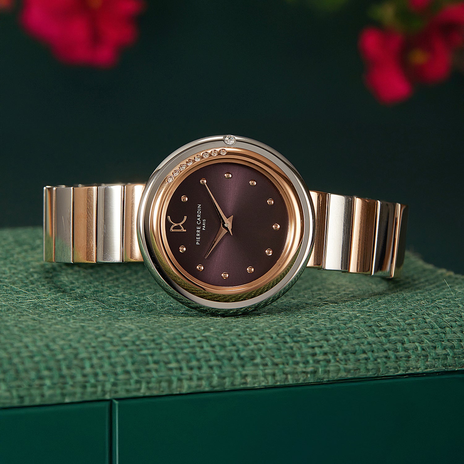 The Passy Météore collection by Pierre Cardin blends timeless elegance with modern sophistication. Featuring a two-tone case in rose gold and silver, this stunning 32mm ladies’ watch showcases a dazzling crystal-adorned bezel and a rich plum dial accented with sparkling crystals. Its unique metal link strap adds a refined touch, while the hidden crown ensures a sleek and seamless design. Powered by a precise two-hand quartz movement, the Passy Météore watch is the perfect accessory for women who appreciate luxury and Parisian style.