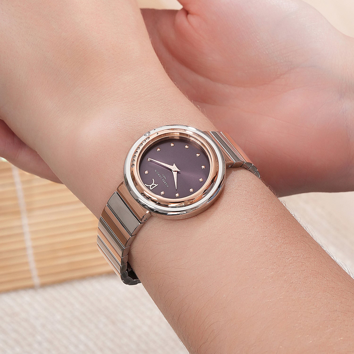 Passy Météore Ladies’ Watch - Two-Tone Rose Gold & Silver Case with Plum Dial, Crystal Bezel, and Metal Link Strap