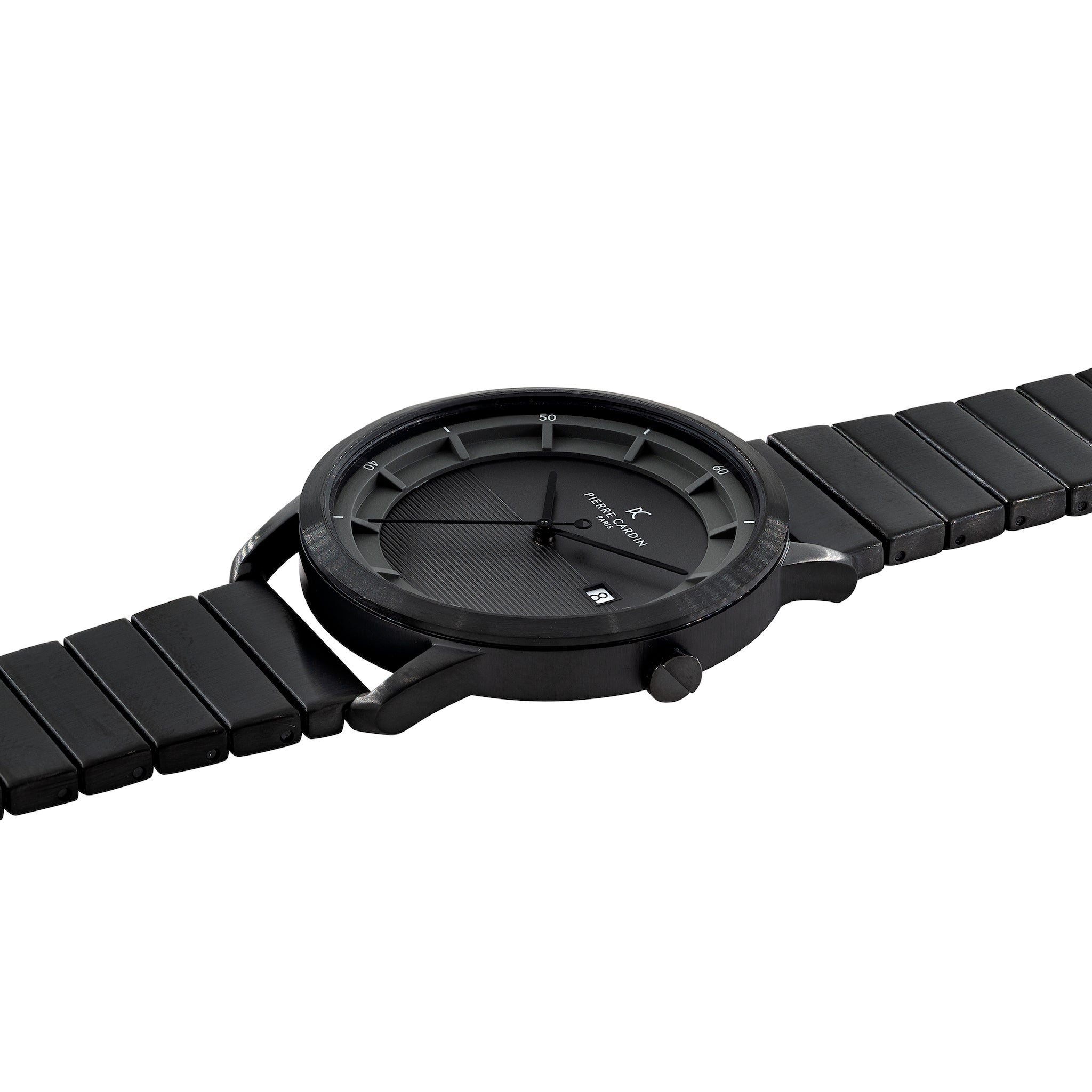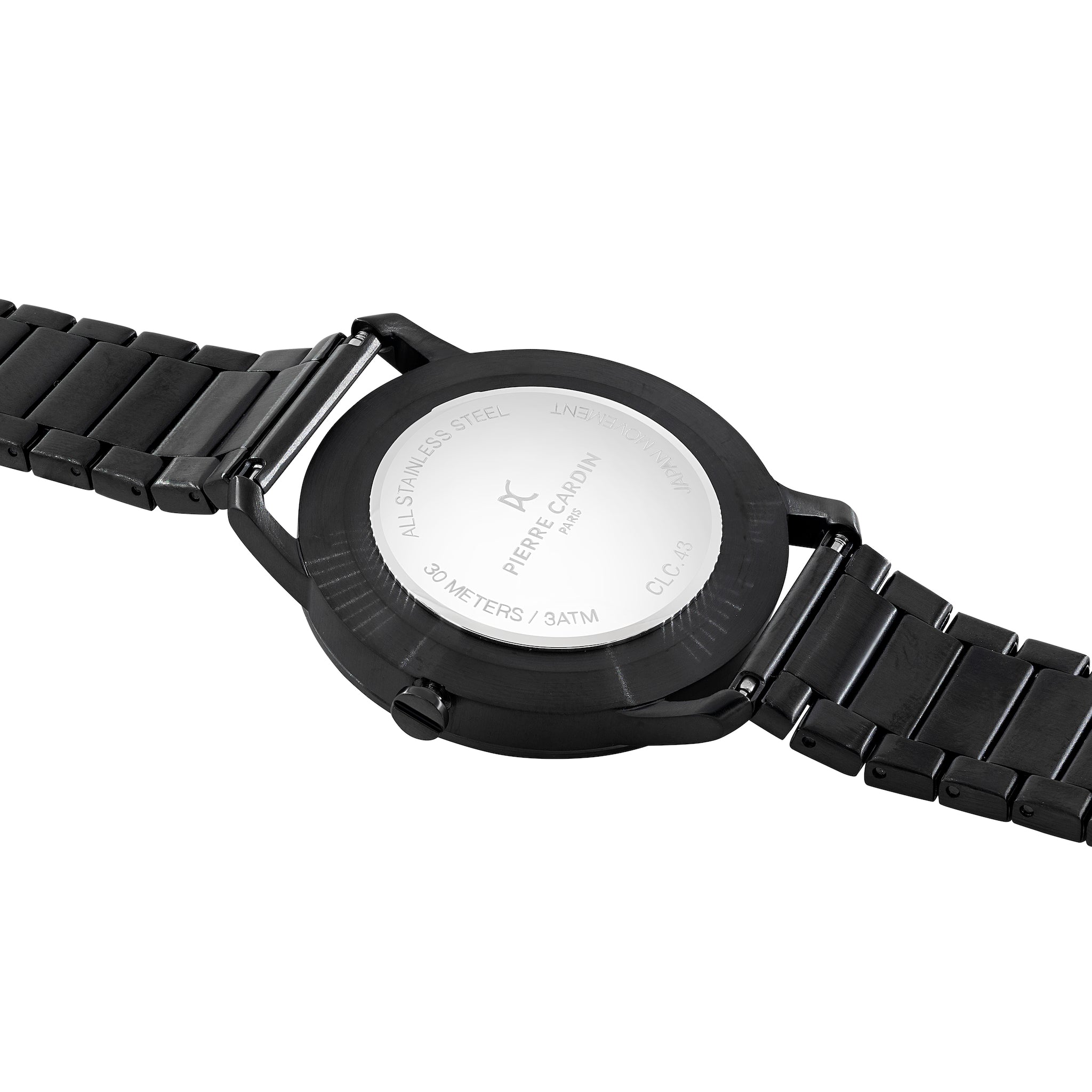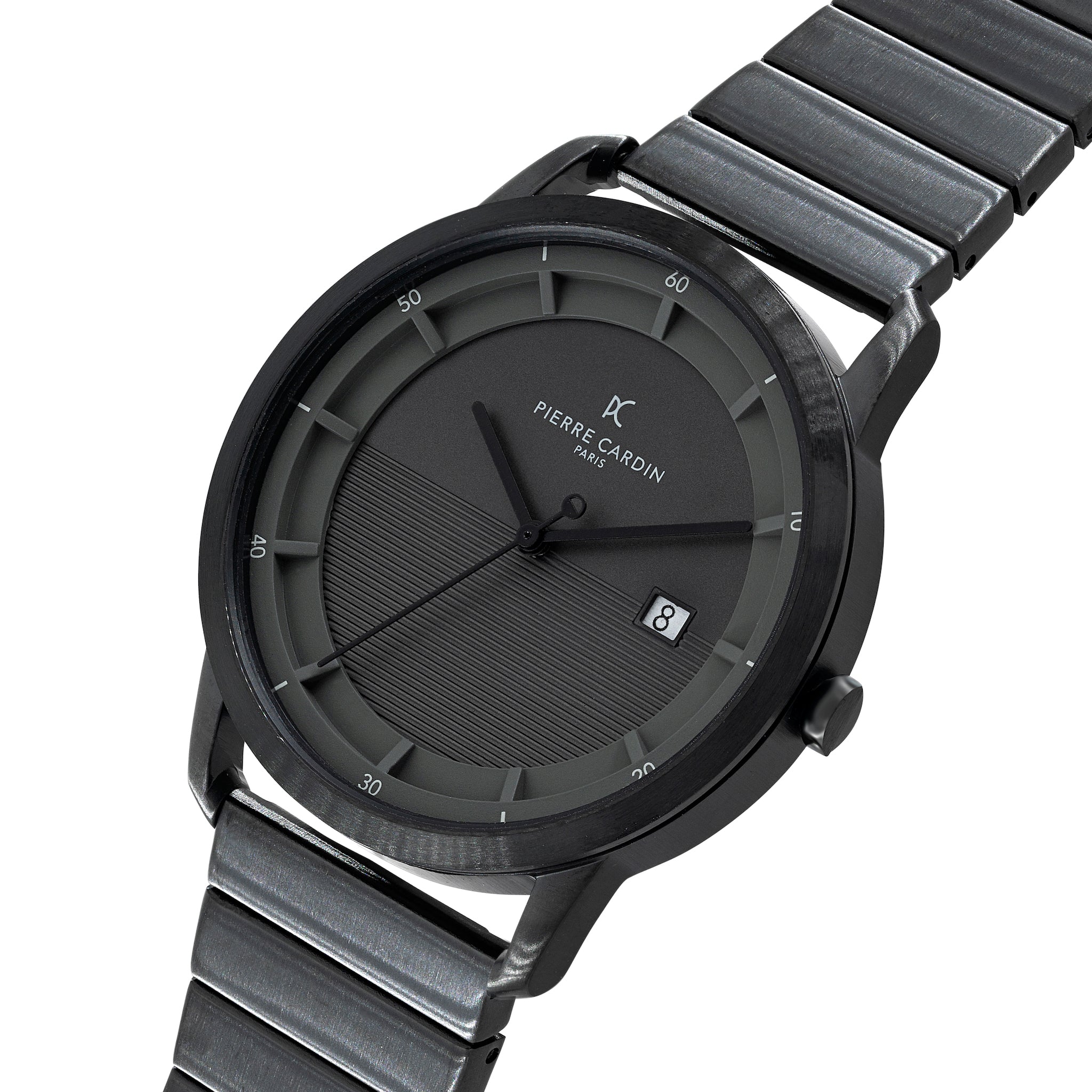 Pierre Cardin mens watch inspired by the Parisian region of St. Germain, this watch features a Black tone stainless steel case, Black dial with lines pattern and a metal link strap. The three-hand movement includes a date display at the 3 o'clock position, and the watch is powered by a reliable quartz movement. The metal link strap is made of stainless steel, adding a touch of luxury to the overall design. This watch is suitable for both casual and formal occasions, and would make a great addition to any wardrobe.